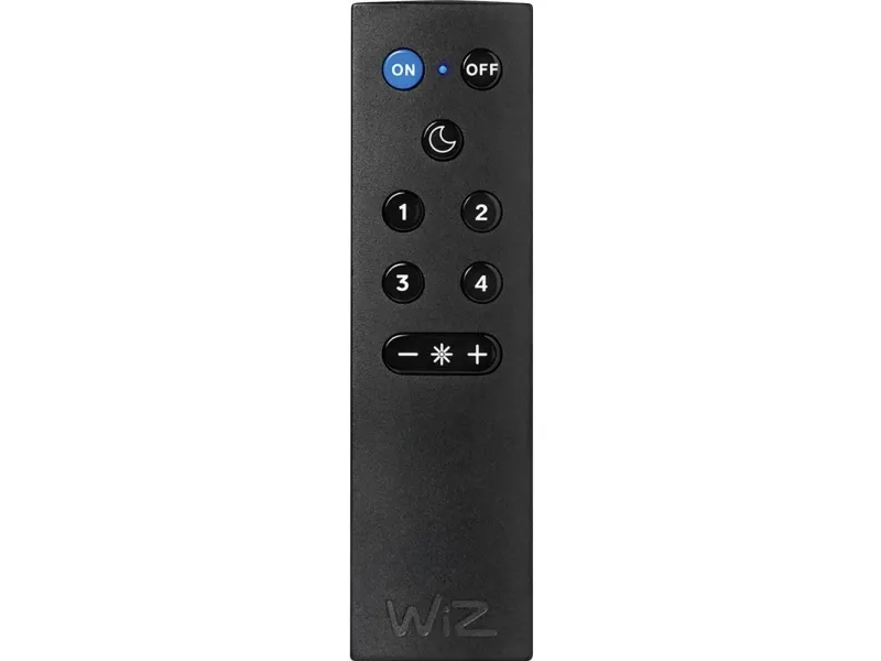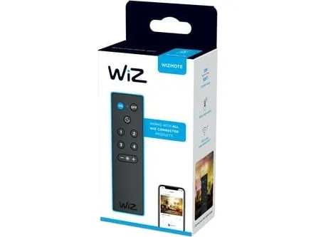 WiZmote gir deg rask og enkel kontroll over WiZ-lysene. Still inn lysene til å skru seg av og på, juster lysstyrken og endre til nattlampe og velg mellom fire favorittlysmoduser ved å trykke på en knapp. Fungerer med alle tilkoblede WiZ-produkter og styrer alle lysene i et rom. Stort kontrollområde på opptil 15 meter og den fungerer selv om Wi-Fi er nede.