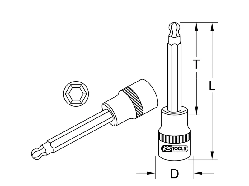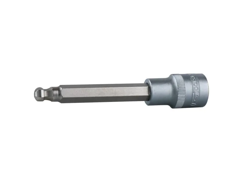 1/2 bit-topnøgle-indsats med kuglehoved, lang, 7mm Kuglehoved-indvendig sekskantIndvendigt firkantdrev iht. din 3120 / ISO 1174 med kuglefangerillelang udgaveMed indpresset, forniklet bitindsatsTil manuel betjeningmat satineretKrom vanadium
