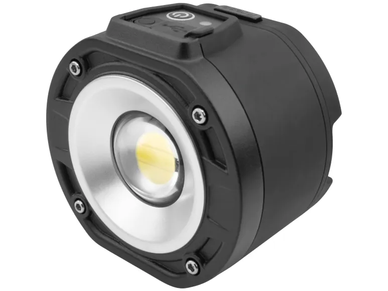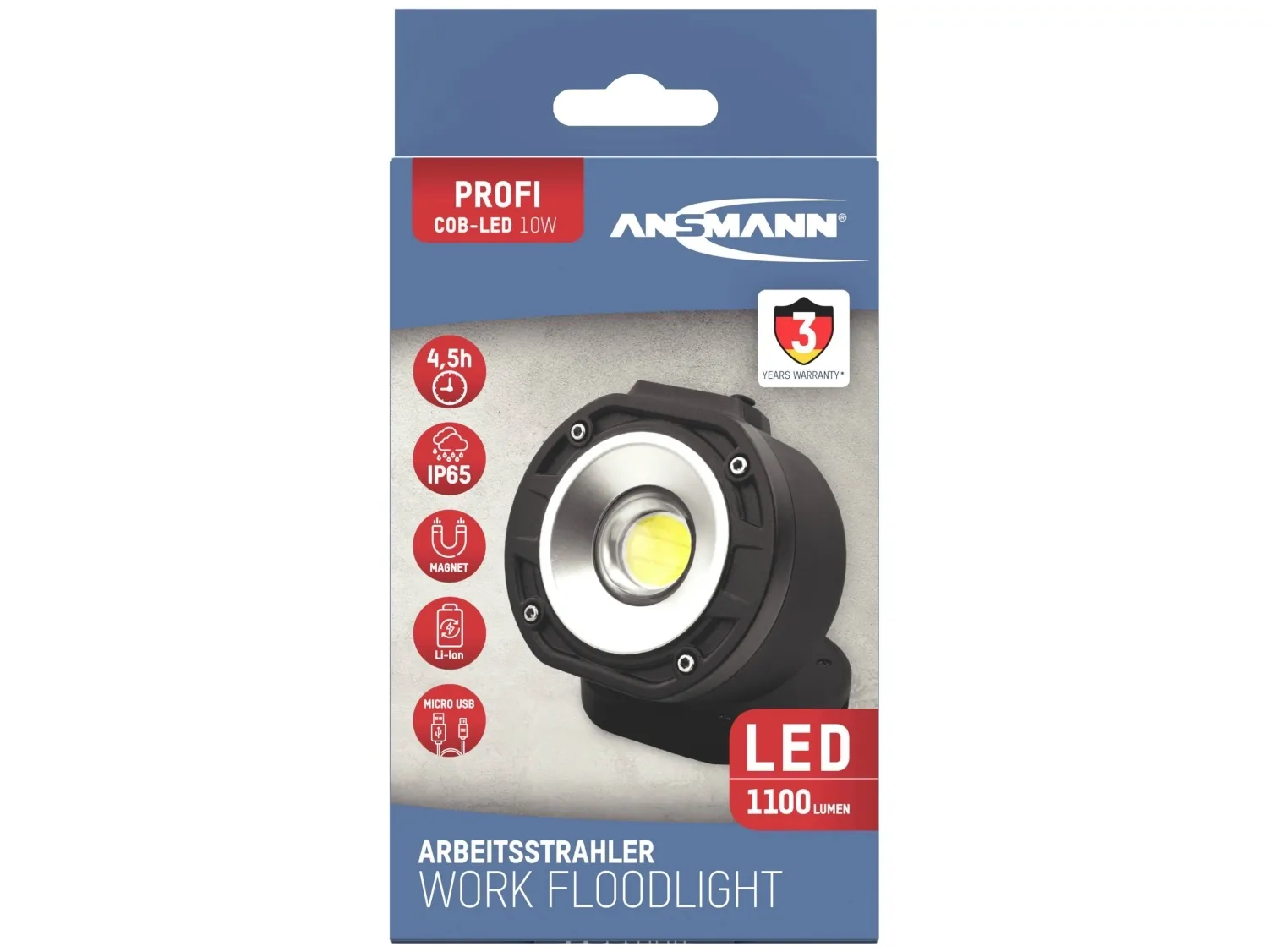 Arbejdslampe Pocket 1100 Professionel arbejdsspot med 10W COB-LED, genopladelig, 360° drejeligt kugleled, med magneter og påhængskroge. 100% + 50% tilstand - altid det optimale lys til dit arbejde. Den homogene belysning er ideal for arbejde ved indendørs og udendørs brug - for eksempel på værksteder, byggepladser, industri, i huset, i haven, Gård eller garage. Integreret Li-Ion-batteripakke med sikkerhedselektronik - beskytter mod overopladning og dybdeafladning. 360° kugleled og 360° drejelig påhængskrog. Integrerede magneter i foden, derved uforseglede fastgørelsesmuligheder på metalliske genstande. Kan anvendes fleksibelt med kugleled, hvilket gør, at lyset nemt og bekvemt kan anvendes på det rigtige sted.