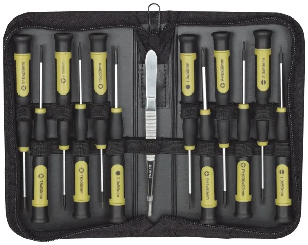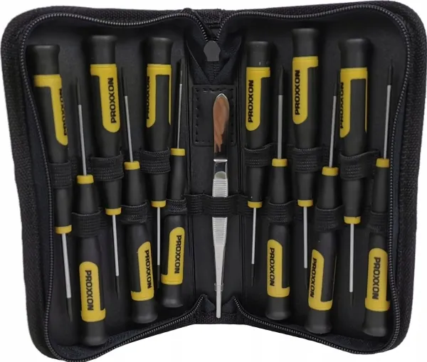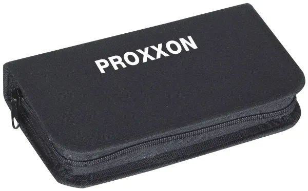 MICRO-DRIVER-skruetrækkersæt, i taske (13 dele) Af højlegeret nikkel-krom-molybdæn-stål · I funktionel taske med lynlås. 13-delt MICRO-DRIVER-sæt fra Proxxon leveres i en funktionel taske med lynlås, til sikker opbevaring på værkstedet eller til rejsen. Klinger af nikkel-krom-molybdæn-stål af høj kvalitet (SAE 8660). For ekstrem hårdhed og sejhed. Forkromet med bruneret spids. Ergonomisk formet 2-komponentgreb af plast i høj kvalitet (slagfast, olie- og syrebestandig) med bløde komponenter i grebet. Drejeligt centreringshoved og fingerfordybning. 1 pincet til greb af små skruer og små dele.