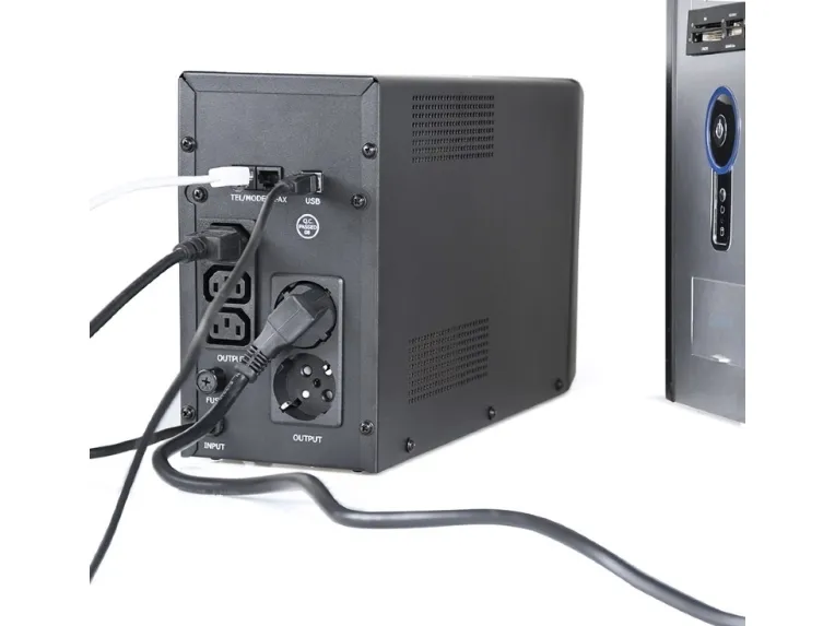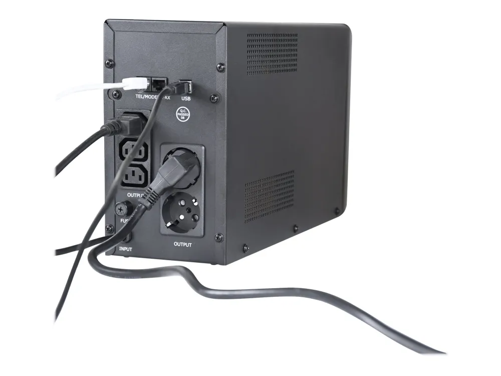 In order to work correclty, the connected load should be at least 5% of the maximum capacity of the UPS. For example, a 700 W UPS needs at least a connected load of 35 W to work. Inhoud: UPS Power cord USB cable Software CD Spare fuse