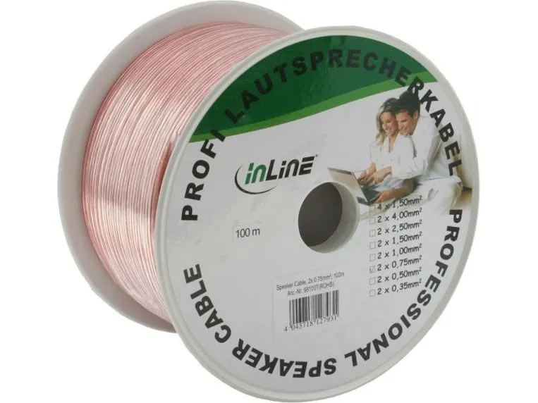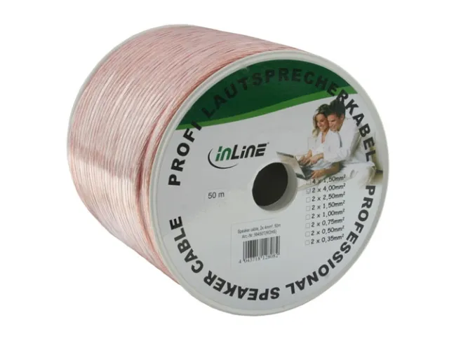 - Speaker cable, highly flexible.\n- Transparent sheath, with coded wire.\n- Material CCA (copper-aluminum alloy).\n- Diameter 2x4mm².\n- Design: 2x 7x 32x 0.15mm².\n- Outer dimensions: ca.5x10mm.\n- on plastic reel.