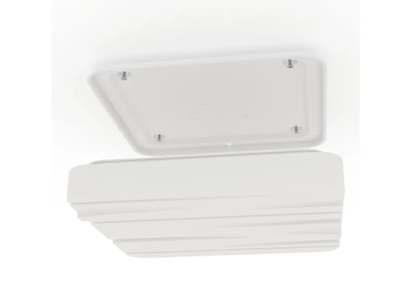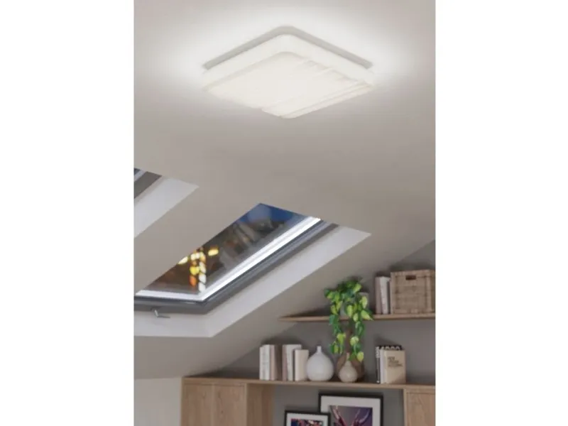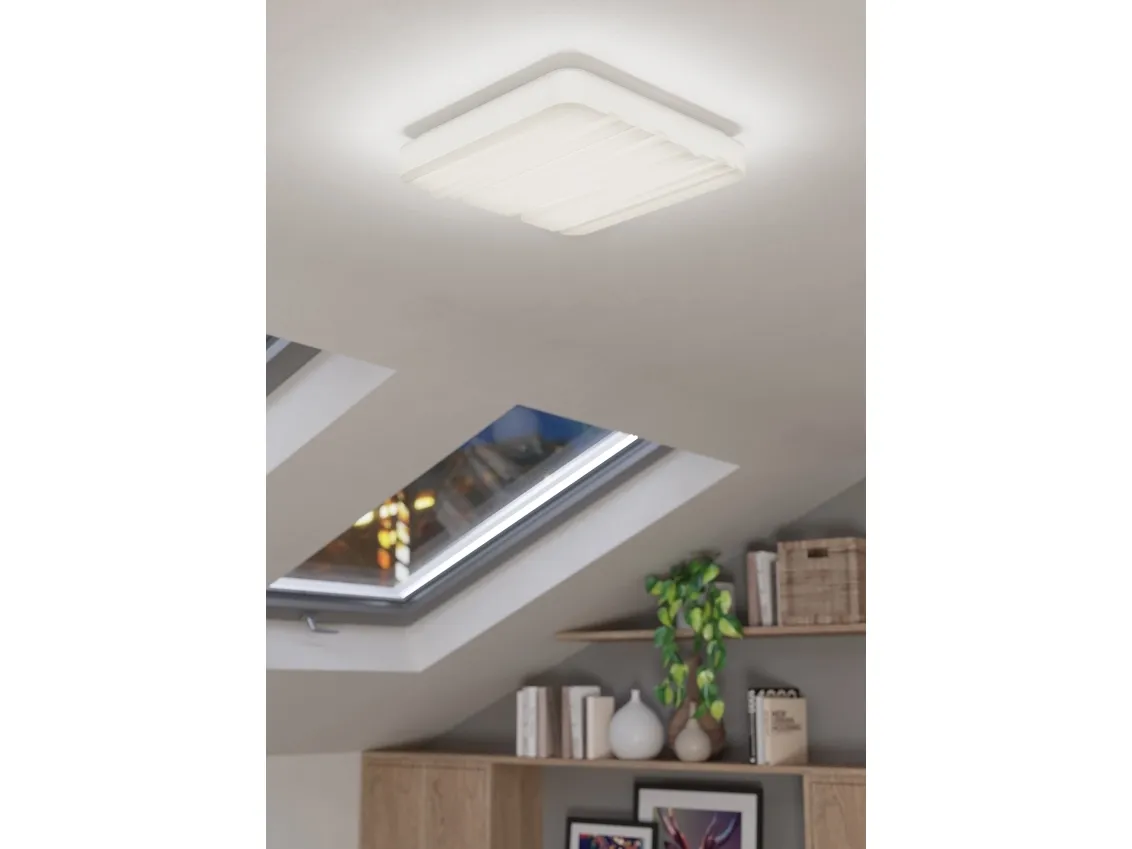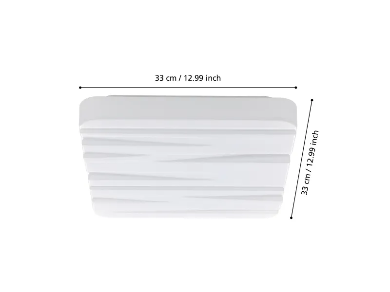 EGLO FERENTINO plafond i hvid med dekorative fordybninger i skærmen. Højde 6 cm, længde 33 cm, bredde 33 cm. LED, 14,6 watt, 1600 lumen, 3000 kelvin. IP20. Dette produkt indeholder en lyskilde med energieffektivitetsklasse: F.