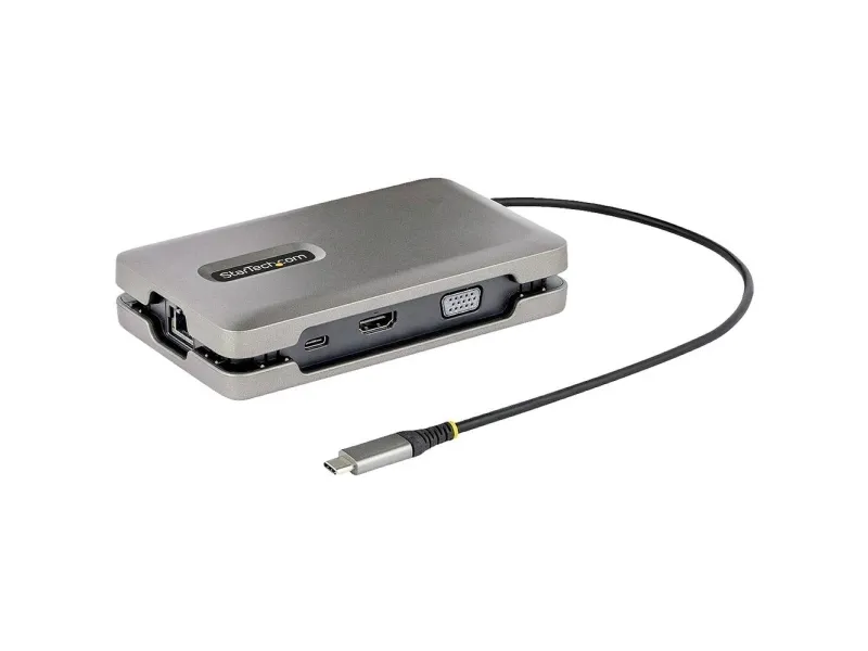 This USB-C Multiport Adapter/Docking Station with DisplayPort 1.4 (Alt Mode) and Multi-Stream Transport (MST), features three video output options (HDMI, VGA and USB-C video) to support a single or multi-monitor workstation. The USB-C video port supports USB 3.2 Gen 2 (10 Gbps) with 10 W of power, to connect a USB-C monitor or a USB-C peripheral. In addition, the Docking Station also features a 2-Port USB-A 3.2 Gen 2 (10 Gbps) Hub, a Gigabit Ethernet port, and providing advanced charging through a USB Power Delivery (PD) 3.0 pass-through port. The Multiport Adapter connects to a laptop's USB-C or Thunderbolt 3/4 port, using the integrated 10-inch (25 cm) USB-C cable.