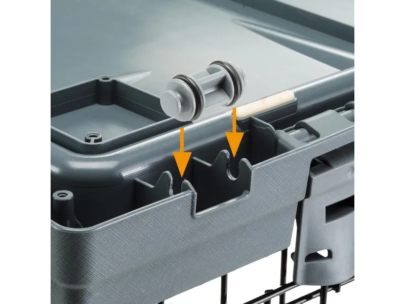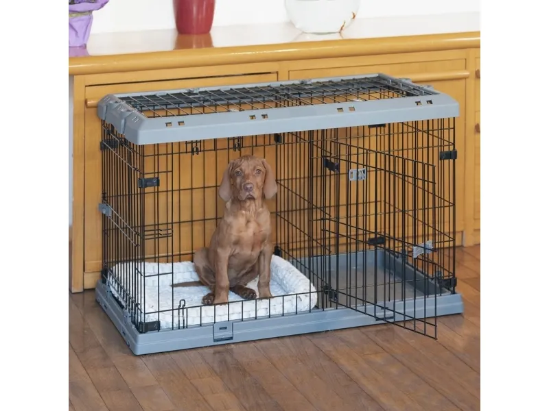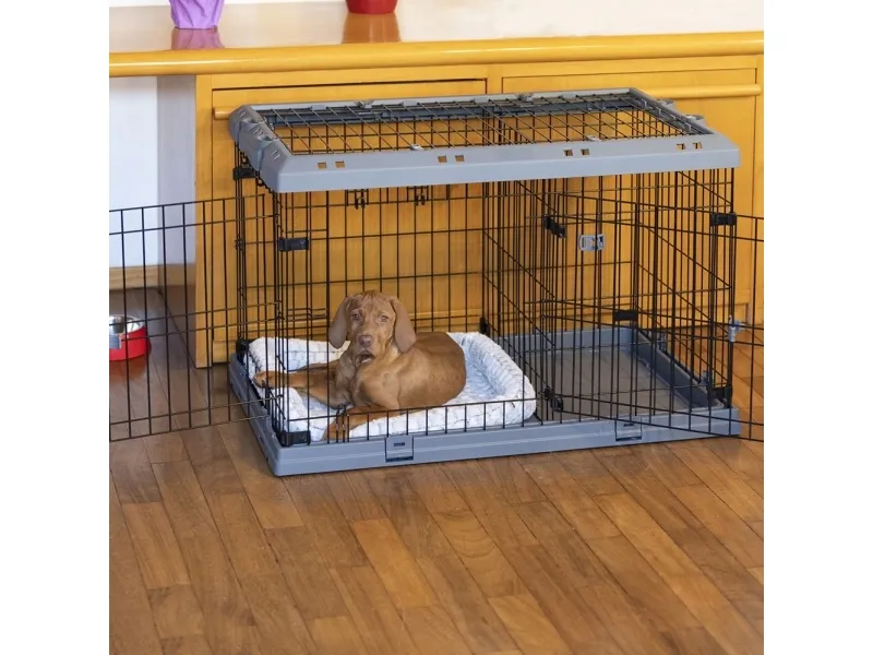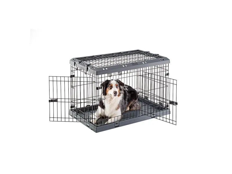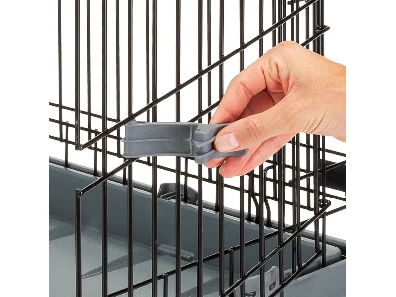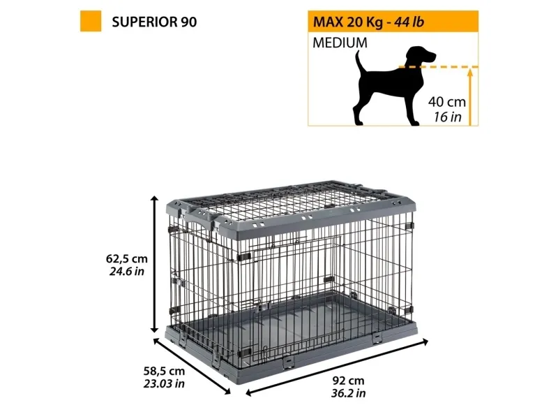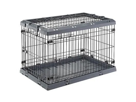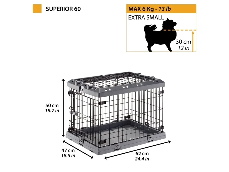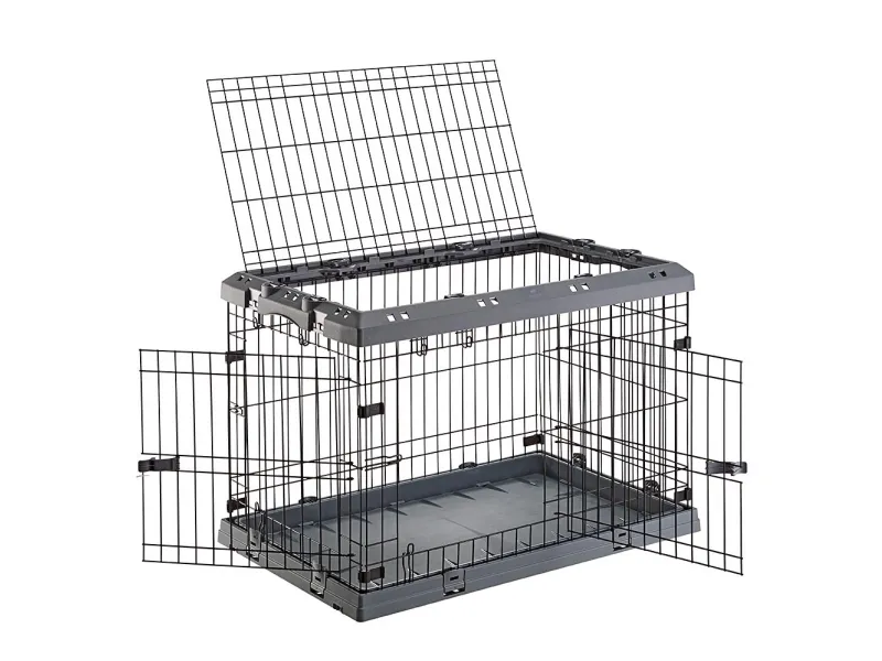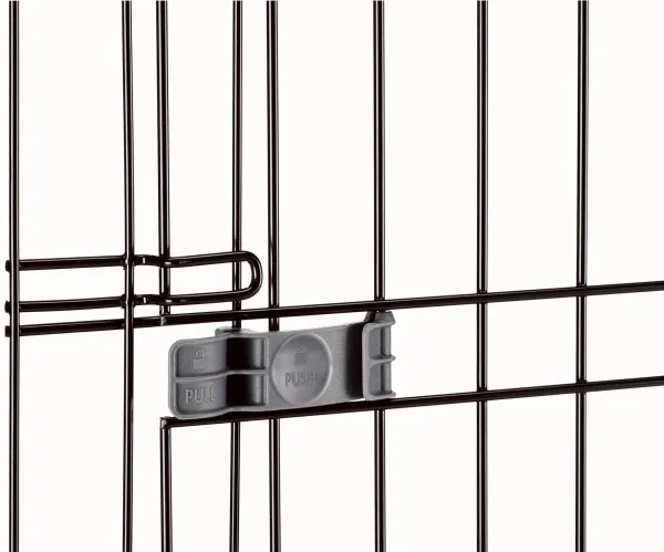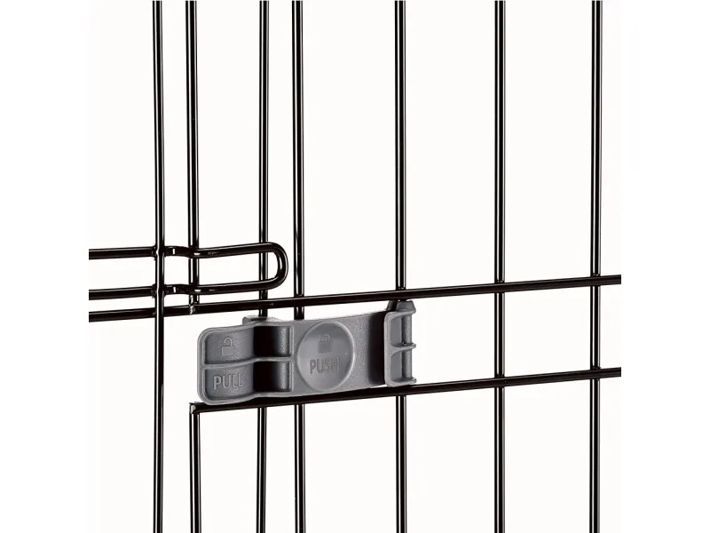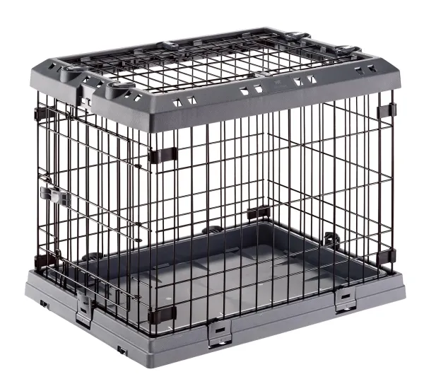 Stabil stålbur med ram och botten av plast. Buren har öppningsbart tak, två dörrar samt en avskiljningsvägg. Den unika botten har ett avrinningssytem om olyckan skulle vara framme. Rullhjul för kortare förflyttningar (max 2-3m). Enkel att fälla ihop.