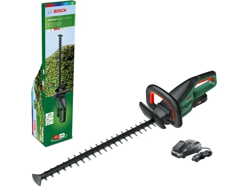 Boschs batteridrevne 18V UniversalHedgeCut 18V-50 med børsteløs motor leverer høy effekt, noe som gir betydelig lengre levetid. Den lette konstruksjonen reduserer belastningen, noe som gjør det behagelig å arbeide lenge med hekksaging. UniversalHedgeCut 18V-50 er det perfekte valget for trimming av mellomstore hekker som bartrær, liguster, laurbær og bøk med en grentykkelse på opptil 20 mm. Med en batteritid på opptil 75 minutter og en batteriindikator som gjør det enkelt å kontrollere batteristatusen mens du arbeider, er risikoen for å gå tom for strøm betydelig redusert. Det laserskårne, diamantslipte bladet gir skarpe kutt av høy kvalitet for optimal ytelse og holdbarhet.