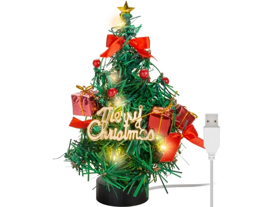with Christmas decoration, 15 micro LEDs in warm white (2700 K) and 75 cm USB cable, height approx. 22 cm Goobay LED Mini Christmas Tree. Product type: Light decoration figure, Product colour: Black, Gold, Green, Red, Housing material: Plastic. Number of bulbs: 15 bulb(s), Bulb type: LED, Light colour: Warm white. Power source type: USB, Operating voltage: 5 V. Height: 220 mm, Diameter: 12 cm, Weight: 85 g. Quantity per pack: 1 pc(s), Package type: Box