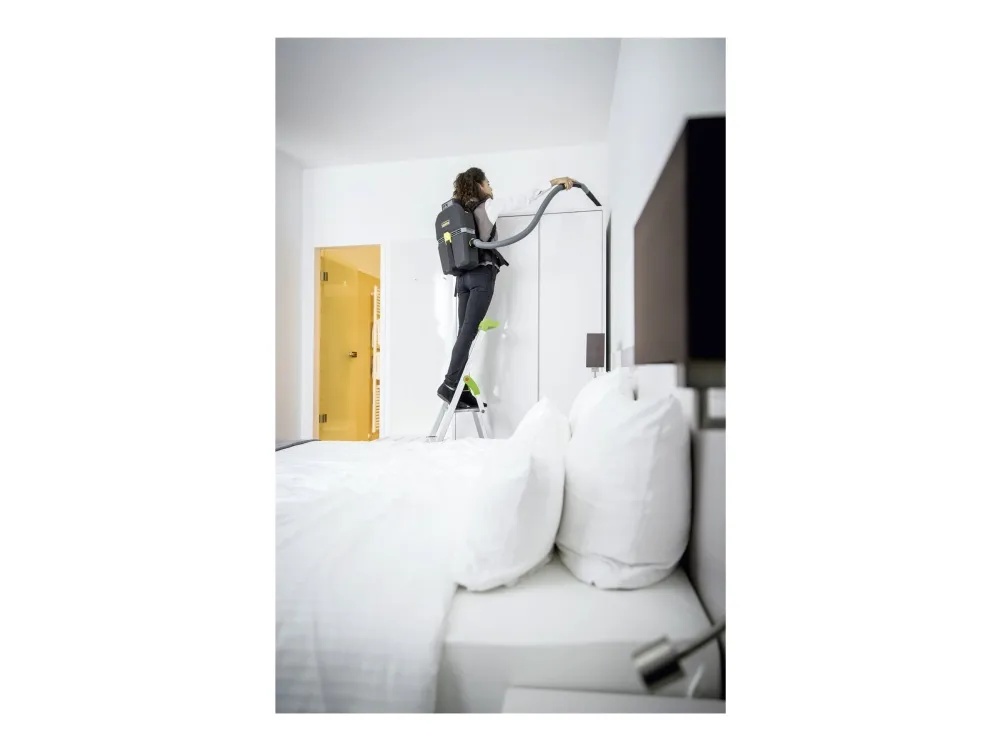 Kärcher BVL 5/1 Bp er en allsidig ryggstøvsuger som er utviklet for å gi effektiv rengjøring uten problemer med ledninger. Med en støvkapasitet på 5 liter gir denne støvsugeren mulighet for langvarig bruk og pålitelig ytelse. Den har en justerbar sugemekanisme, slik at brukerne kan skreddersy rengjøringskraften i henhold til den aktuelle oppgaven. Støvsugeren er utstyrt med et forfilter og øko-modus som fanger opp støv samtidig som energiforbruket holdes lavt. Den integrerte tilbehørsoppbevaringen sørger for at alle nødvendige verktøy er lett tilgjengelige, noe som gjør den egnet for ulike rengjøringssituasjoner.