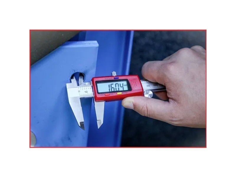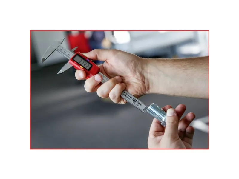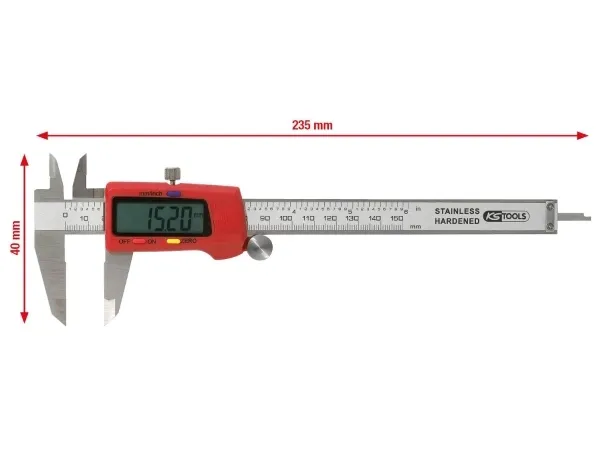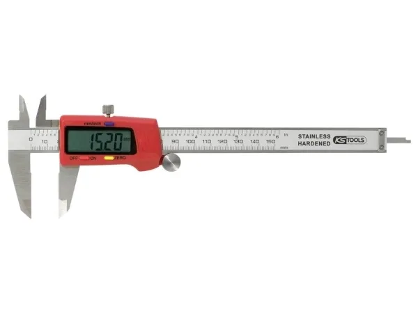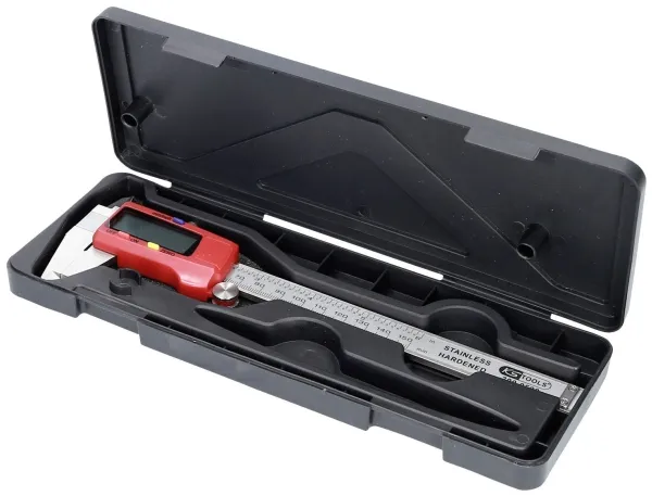 Digital skydelære 0-150 mm iht. DIN 862Med låseskrue og finindstilling af hjulTil udvendige-, indvendige, trin- og dybdemålingerSkaladeling i sortMåleskinner i mm og tommer-delingMm/tommer-omskiftningMed gevindtabelReset (nulstil) er mulig i alle positionerStort LCD-display - cifferhøjde 10,0 mmMed automatisk frakoblingfuldstændigt hærdet og meget fin forarbejdetRustfrit stålI stabilt plastetui