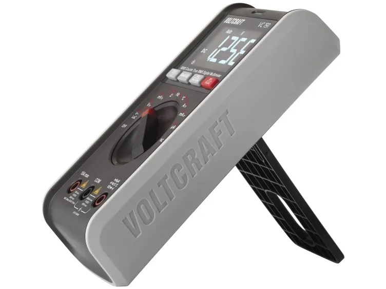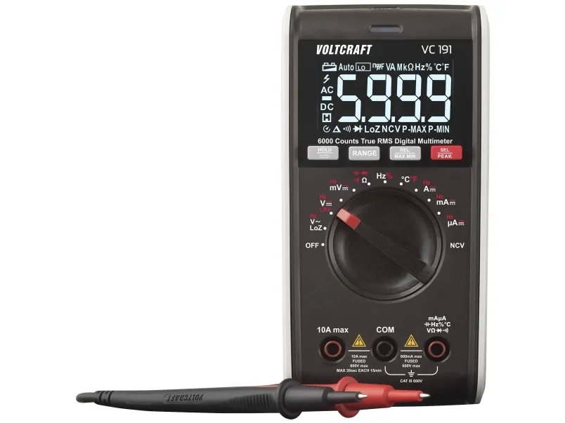 Digitalt multimeter VC191 AC/DC-spændingsmåling AC/DC-strømmåling op til 10 A Modstandsmåling Kapacitetsmåling Temperaturmåling. Frekvensmåling Duty-cycle Diodetest Akust. gennemgangstester Low Pass-filter (V/AC) PEAK-registrering LoZ-funktion (Low impedance V/AC) Relativ målefunktion Hold-funktion Visning af lavt batteri Robust kabinet beskyttet af blød gummi Auto-power-off. Display-belysning VOLTCRAFT's håndholdte multimeter VC 191 er et absolut topudstyr fra den kompakte VC 100-serie.
