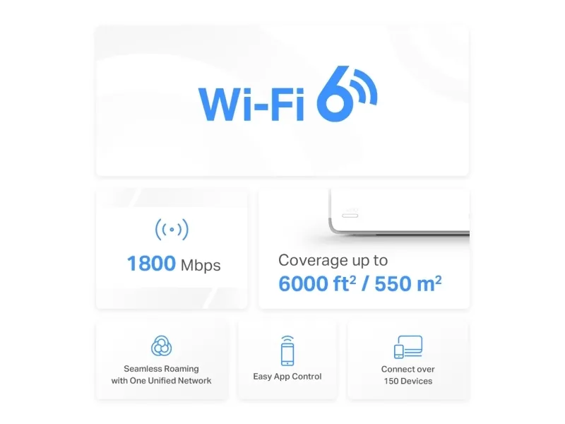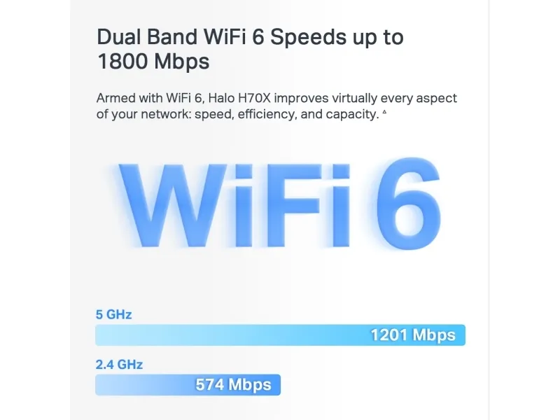 Dual Band WiFi 6 Speeds up to 1800 Mbps Armed with WiFi 6, Halo H70X improves virtually every aspect of your network: speed, efficiency, and capacity.