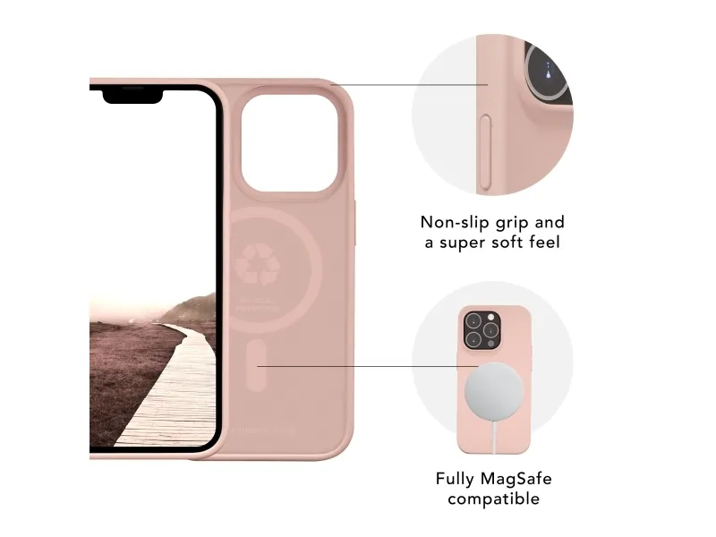 Monaco er et støtbeskyttende telefondeksel i silikon som er laget av resirkulerte plastmaterialer. Du vil elske hvordan det føles i hendene dine, siden dette dekselet har en supermyk og gripevennlig finish. Med knapper som er enkle å trykke på og hevede kanter for å beskytte kameraet og skjermen, tilbyr Monaco fullstendig beskyttelse av telefonen din. Den integrerte MagSafe-magneten sørger for uanstrengt trådløs lading.