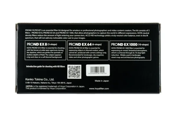 For the past several years slow shutter photography is becoming an extremely popular genre because it provides ample opportunities to express the world around in an artistic and unusual way. For this purpose ND filter appears to be a necessary tool.But which ND filter is better to start with? This question might raise in mind of many amateur photographers who decided to challenge themselves in slow shutter photography. Keeping this question in mind we created an essential ND kit to help photographers quickly start this challenge.HOYA PROND EX FILTER KIT is an essential filter kit designed for amateur or professional photographers and video content creators. The kit consists of 3 ND filters - PROND EX 8, PROND EX 64 and PROND EX 1000, that allow photographer to capture the world in different expressions.The choice of ND filters depends on intentions of the photographer to control the shutter speed or aperture. The content of the HOYA PROND EX FILTER KIT is based on our sales data and experience of selling millions of ND filters all over the world. PROND EX 8, PROND EX 64 and PROND EX 1000 are the most essential ND filters that will help to realize three expressions that we consider to be commonly used among the photographers.HOYA PROND EX FILTER is a high technological product that is designed for still and HDSLR videography. The PROND EX filters use HOYA''s exclusive clear optical glass that incorporates a metallic coating on front and back side to equally reduce almost all range of the light spectrum even in IR area. The ACCU-ND technology used in the coating process yields a truly neutral color balance that will not add any noticeable color cast to your images. HOYA PROND EX filters incorporates precisely developed thick aluminum frame to prevent light leakage, thus obtain correct exposure and color balance.PROND EX 8 (3-STOPS)HOYA PROND EX 8 is essential for shooting with fast lenses at wide open aperture during the daytime, which is perfect for portraiture at shallow depth of field. The subject appears crisp and clear on the soft blurred background. Other recommended scenes are night trails, fireworks and lightnings.PROND EX 64 (6-STOPS)HOYA PROND EX 64 is essential for expressing the object in blurred motion during the daytime, which cannot be realized only with camera settings. Recommended for landscape, city snapshot, video and other photographic genres.PROND EX 1000 (10-STOPS)HOYA PROND EX 1000 is essential for expressing an unreal fantasy world thanks to its 10 stops reduction of the light amount. Widely used in seascape to blur the waves, street snap to apply clouds motion and architecture to erase moving people.PROND EX FILTERS IN VIDEO PRODUCTIONND filters in video shooting is also an irreplaceable tool. For example, when shooting with Sony camera in Slog mode, ISO cannot be set below 800. To obtain natural motion shutter speed is recommended to be adjusted to frame/rate setting. During the daytime PROND EX 8, PROND EX 64, PROND EX 1000 or its combination (like PROND EX 8 + PROND EX 64) would be necessary to achieve cinematic quality.COMBINATIONS OF PROND FILTERSThe choice of ND filters depends on photographer intentions to achieve the desired effect in the image. In case the effect by using single ND filter does not satisfy photographer''s vision, combination of PROND EX filters can also be useful. For example, the combination of PROND EX 8 + PROND EX 64 will give the effect equal to ND500 filter, that can be used to express an unreal fantasy world. The combination of PROND EX 8 + PROND EX 1000 will give the effect equal to ND8000, that will allow to capture the surface of the Sun without overexposure with solid color and visibility of the black spots. Hoya PRO ND EX Filter Kit. Filter size: 6.7 cm, Filter type: Camera filter set. Quantity per pack: 3 pc(s). Product colour: Black