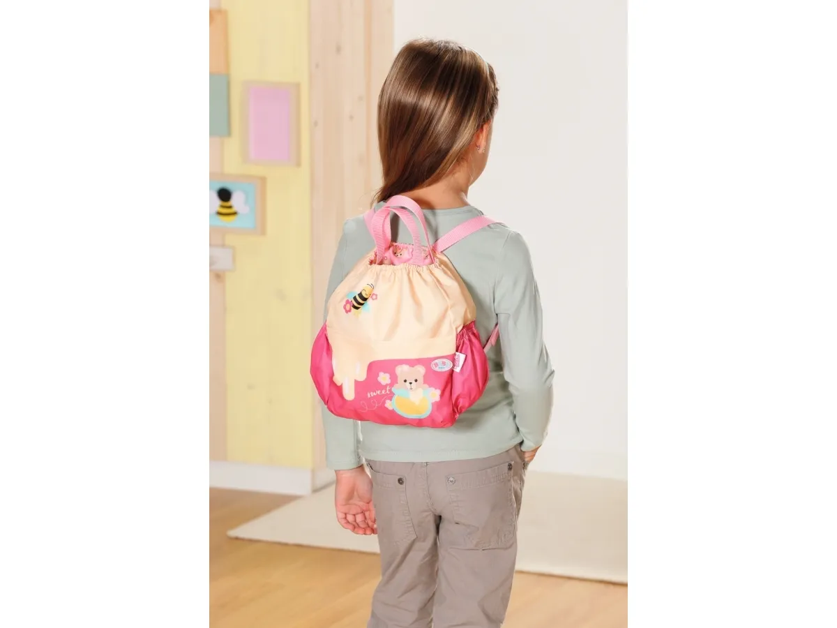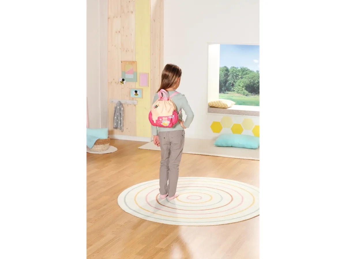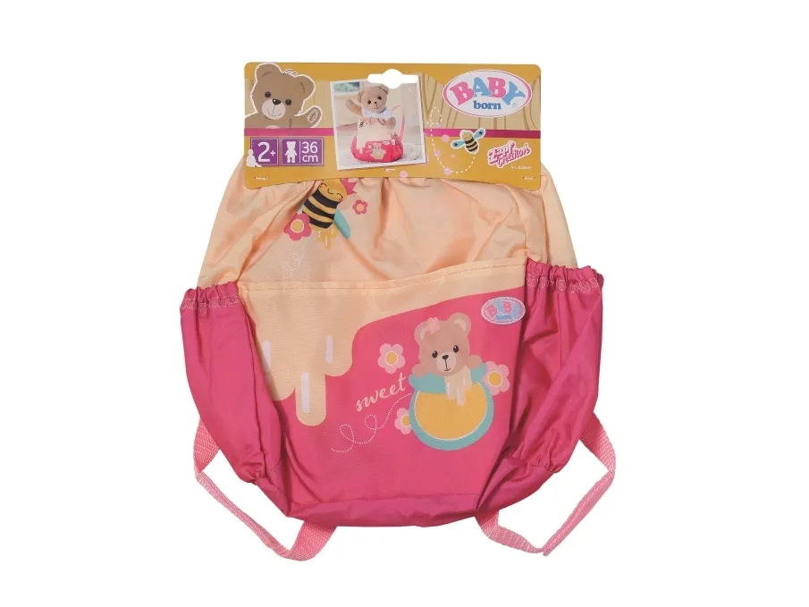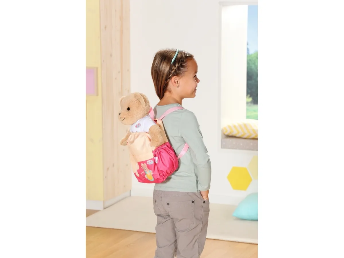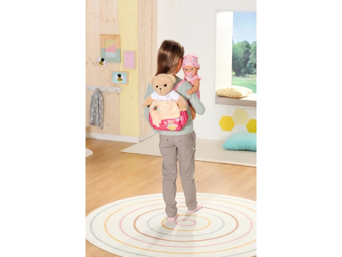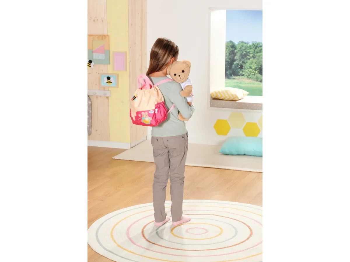 Bamsen kan sitte og se ut fra sekken. BABY born bamsen er super initiativrik. Med denne ryggsekken kan bamsen tas med overalt. Delen i honninggul og rosa er designet slik at BABY born kan titte ut under turen. I tillegg er det nok plass inne i sekken og i de to sidelommene til alt som en bamse og dens bamseforeldre trenger underveis. Det rosa selesystemet kan tilpasses ulike barnestørrelser. Høykvalitetstilbehør til BABY born bamsen og BABY born dukkene. For enda mer, variert og langvarig lekeglede. Fra 24 måneder. Inkluderer: - BABY born bamseryggsekk med justerbart selesystem