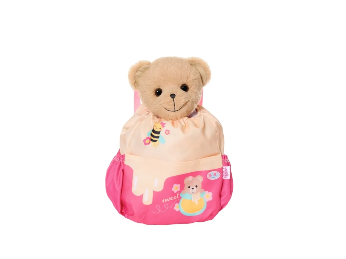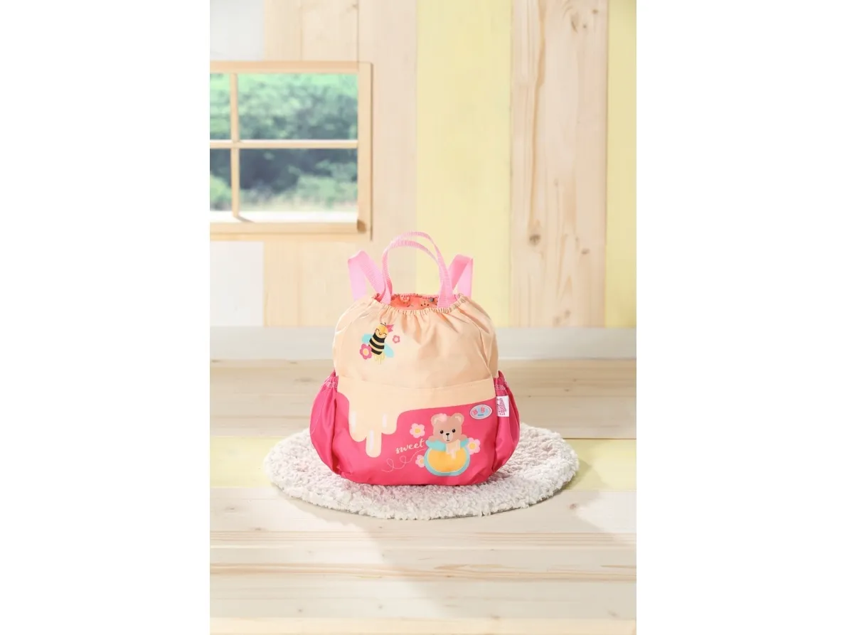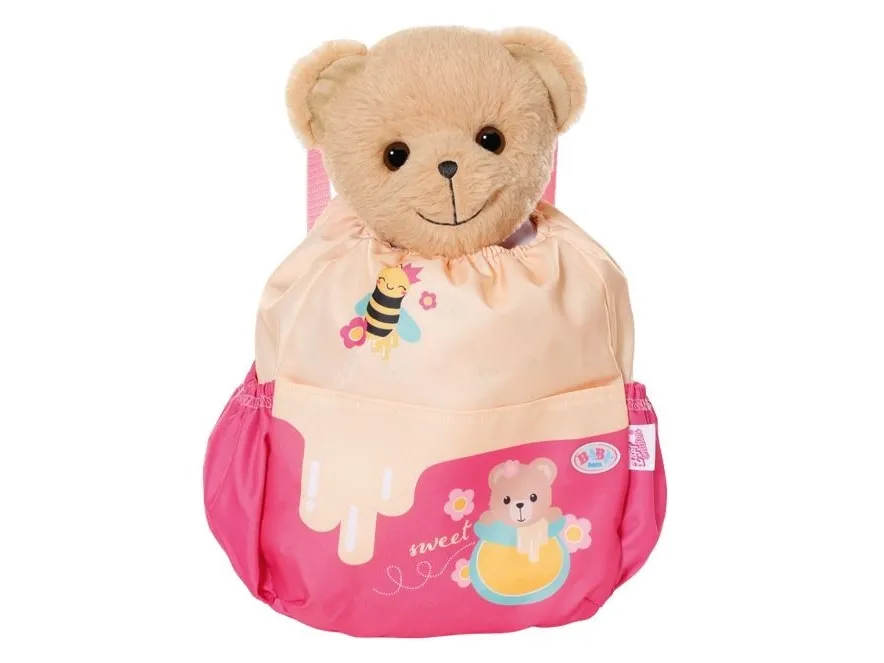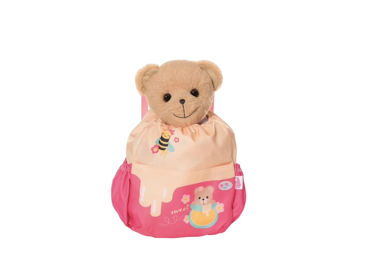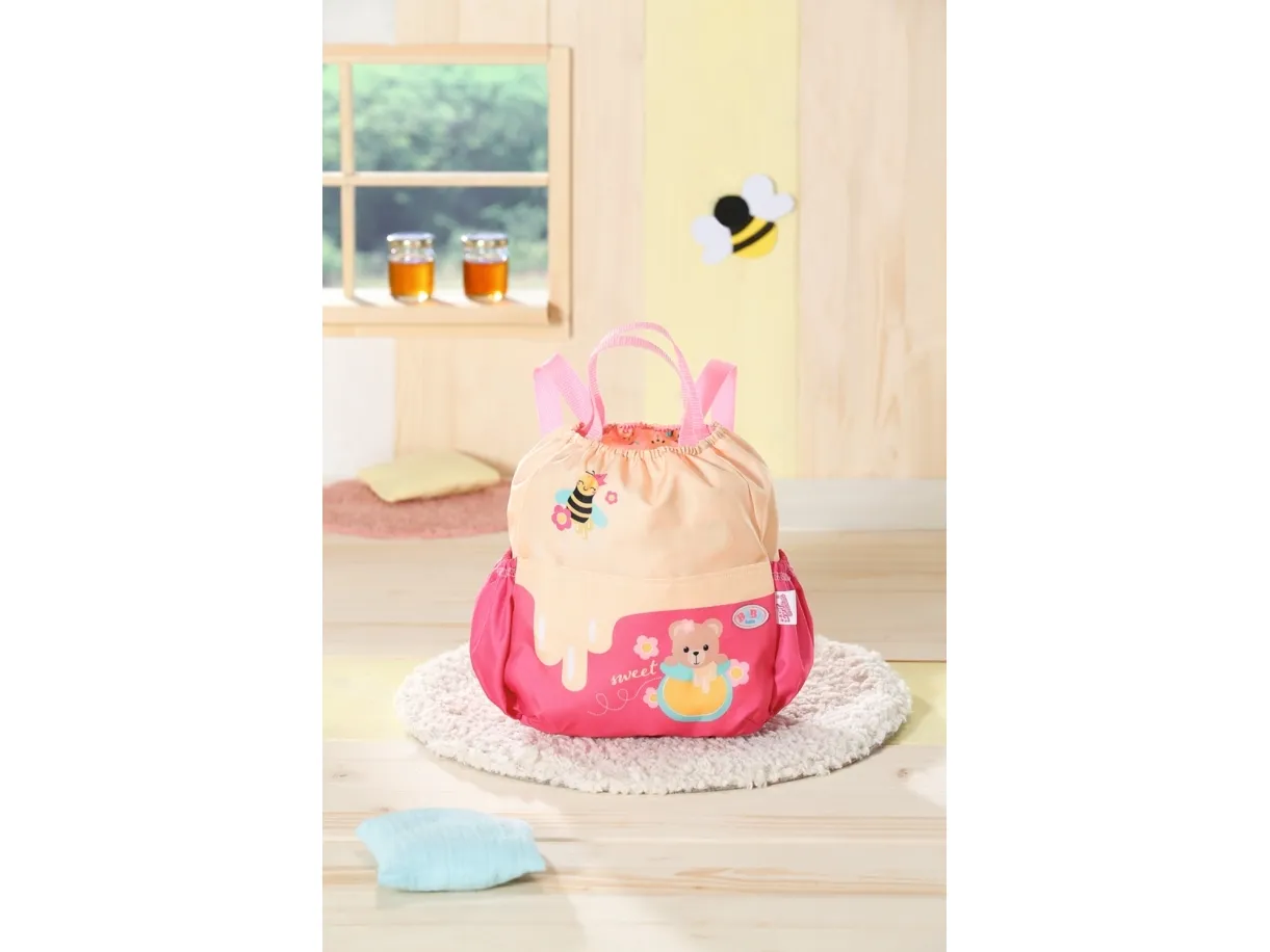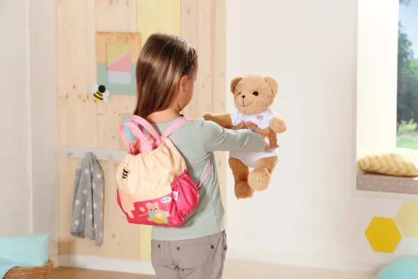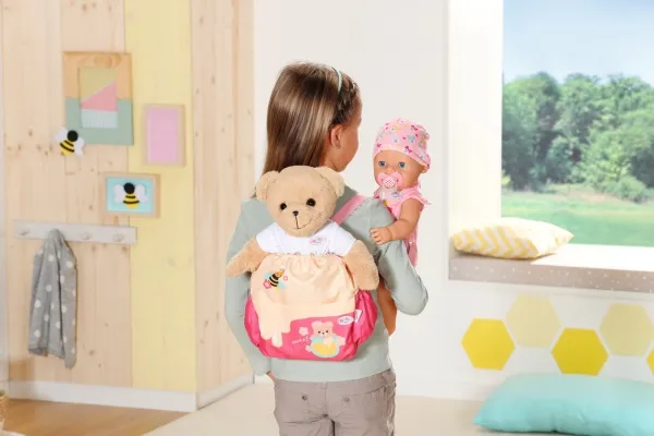 Bamsen kan sitte og se ut fra sekken. BABY born bamsen er super initiativrik. Med denne ryggsekken kan bamsen tas med overalt. Delen i honninggul og rosa er designet slik at BABY born kan titte ut under turen. I tillegg er det nok plass inne i sekken og i de to sidelommene til alt som en bamse og dens bamseforeldre trenger underveis. Det rosa selesystemet kan tilpasses ulike barnestørrelser. Høykvalitetstilbehør til BABY born bamsen og BABY born dukkene. For enda mer, variert og langvarig lekeglede. Fra 24 måneder. Inkluderer: - BABY born bamseryggsekk med justerbart selesystem
