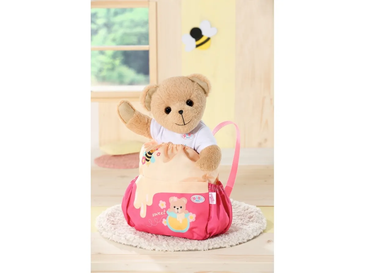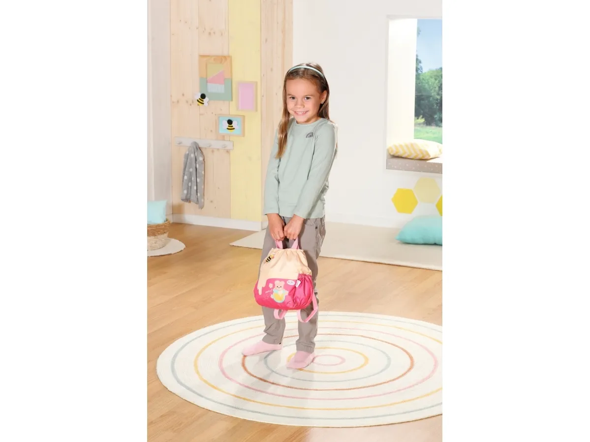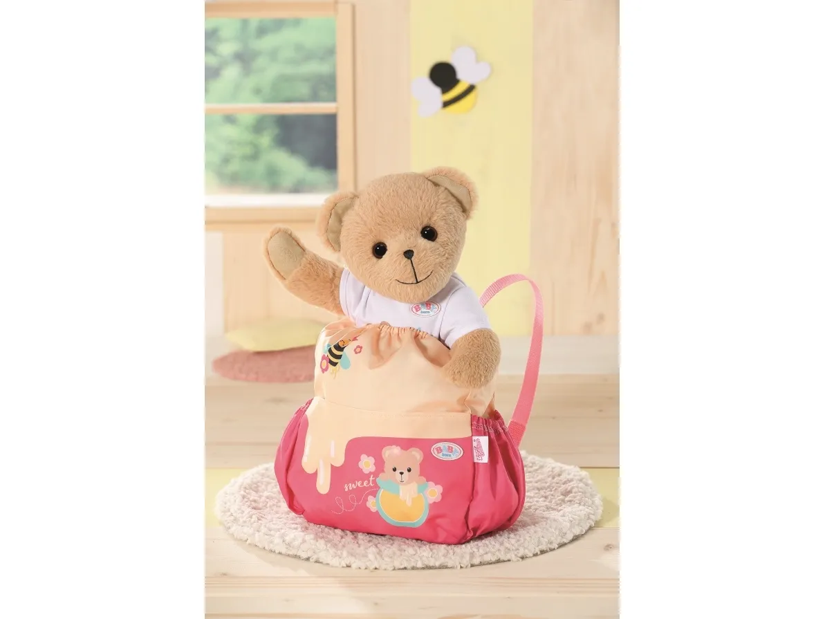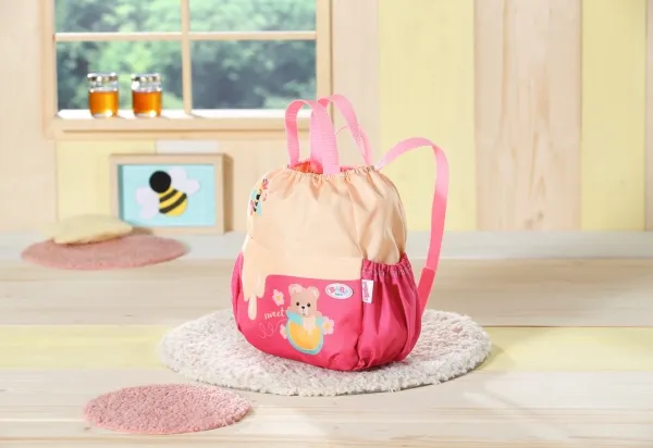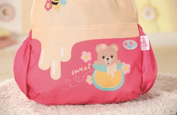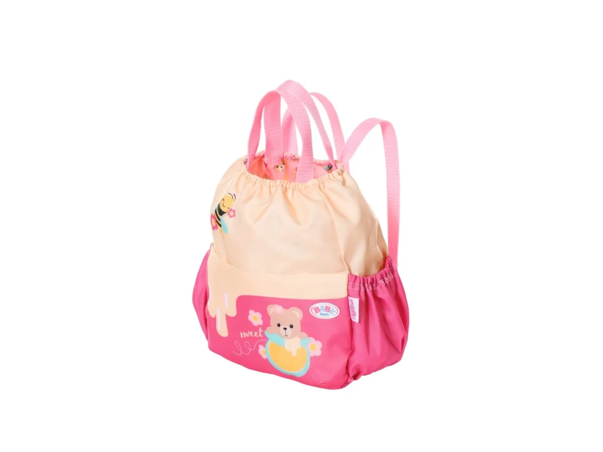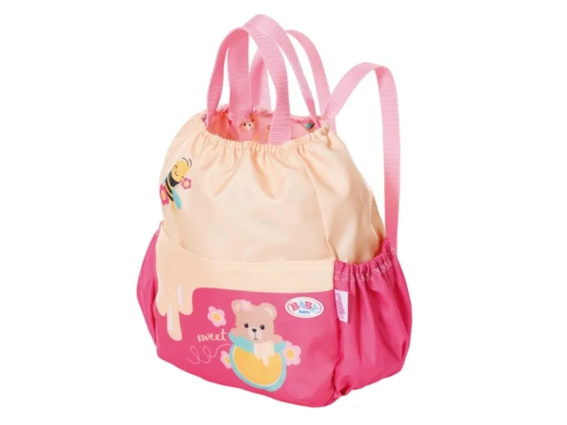 Bamsen kan sitte og se ut fra sekken. BABY born bamsen er super initiativrik. Med denne ryggsekken kan bamsen tas med overalt. Delen i honninggul og rosa er designet slik at BABY born kan titte ut under turen. I tillegg er det nok plass inne i sekken og i de to sidelommene til alt som en bamse og dens bamseforeldre trenger underveis. Det rosa selesystemet kan tilpasses ulike barnestørrelser. Høykvalitetstilbehør til BABY born bamsen og BABY born dukkene. For enda mer, variert og langvarig lekeglede. Fra 24 måneder. Inkluderer: - BABY born bamseryggsekk med justerbart selesystem