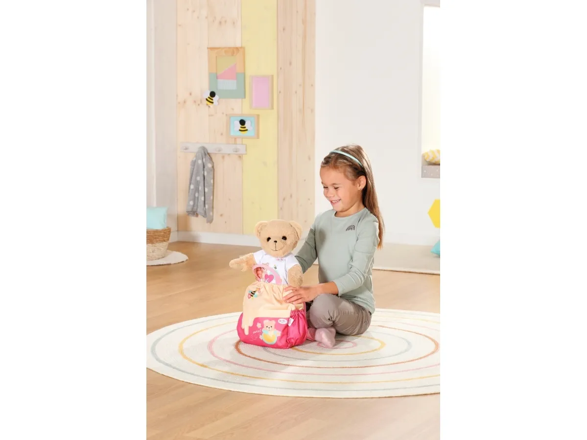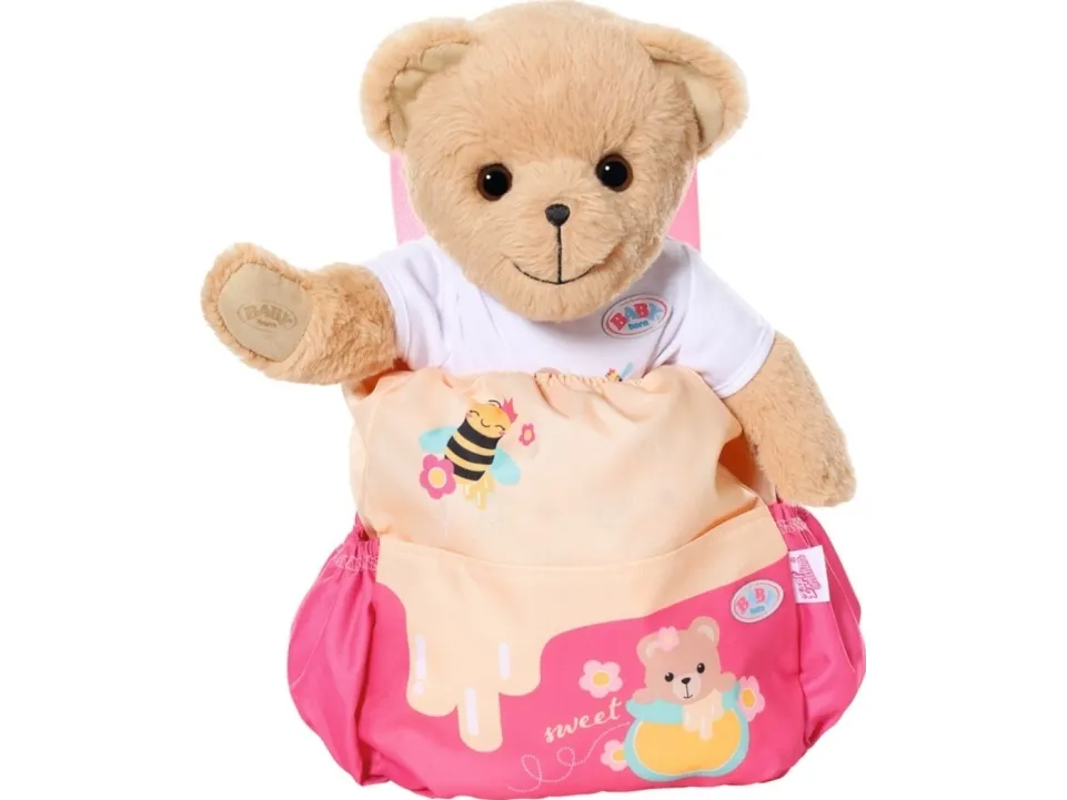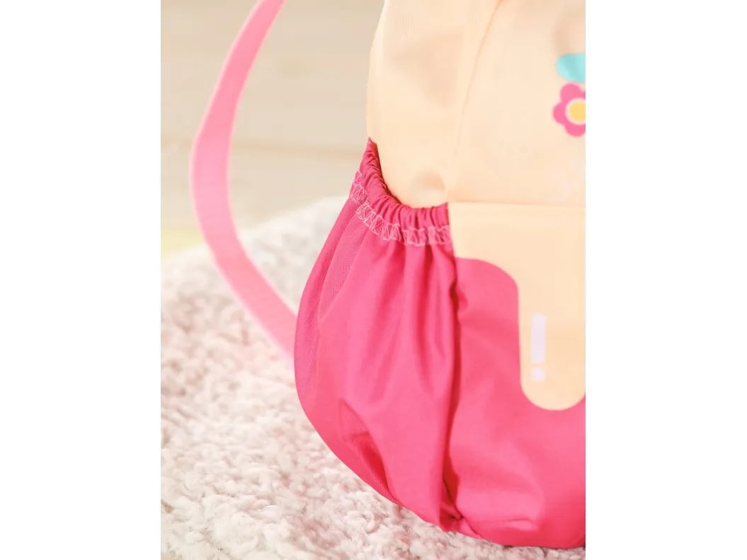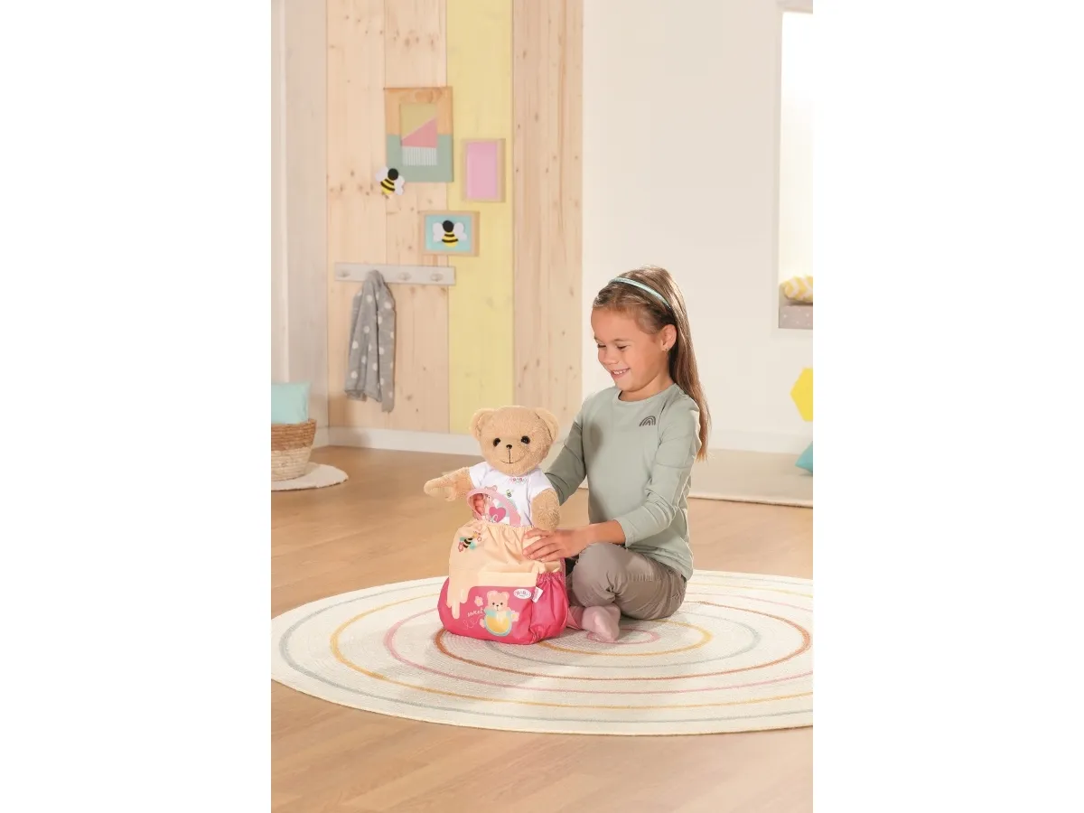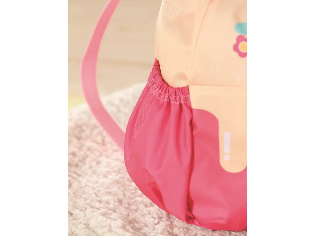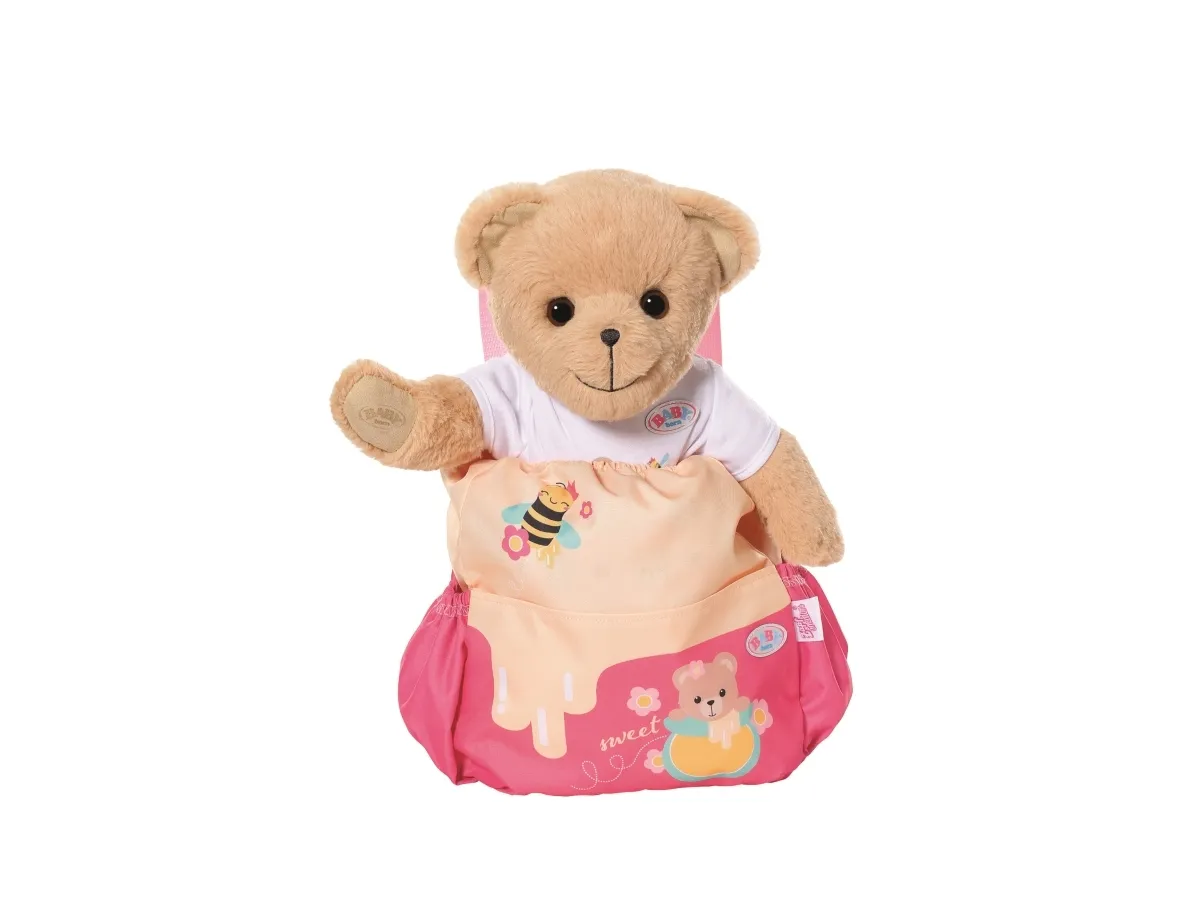 Bamsen kan sitte og se ut fra sekken. BABY born bamsen er super initiativrik. Med denne ryggsekken kan bamsen tas med overalt. Delen i honninggul og rosa er designet slik at BABY born kan titte ut under turen. I tillegg er det nok plass inne i sekken og i de to sidelommene til alt som en bamse og dens bamseforeldre trenger underveis. Det rosa selesystemet kan tilpasses ulike barnestørrelser. Høykvalitetstilbehør til BABY born bamsen og BABY born dukkene. For enda mer, variert og langvarig lekeglede. Fra 24 måneder. Inkluderer: - BABY born bamseryggsekk med justerbart selesystem
