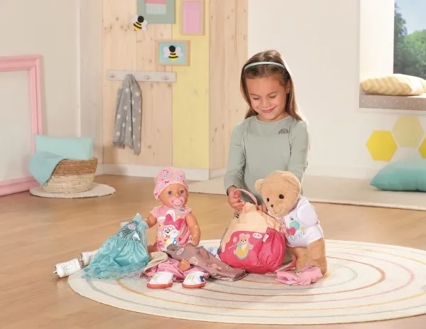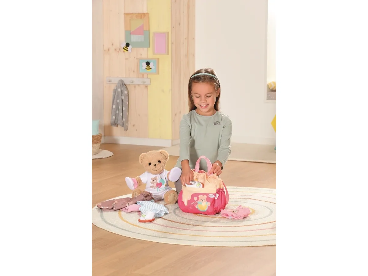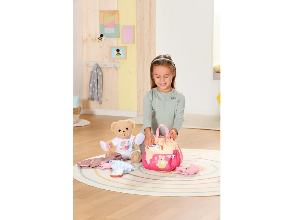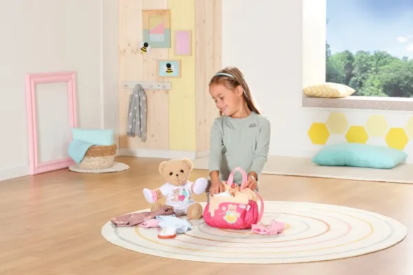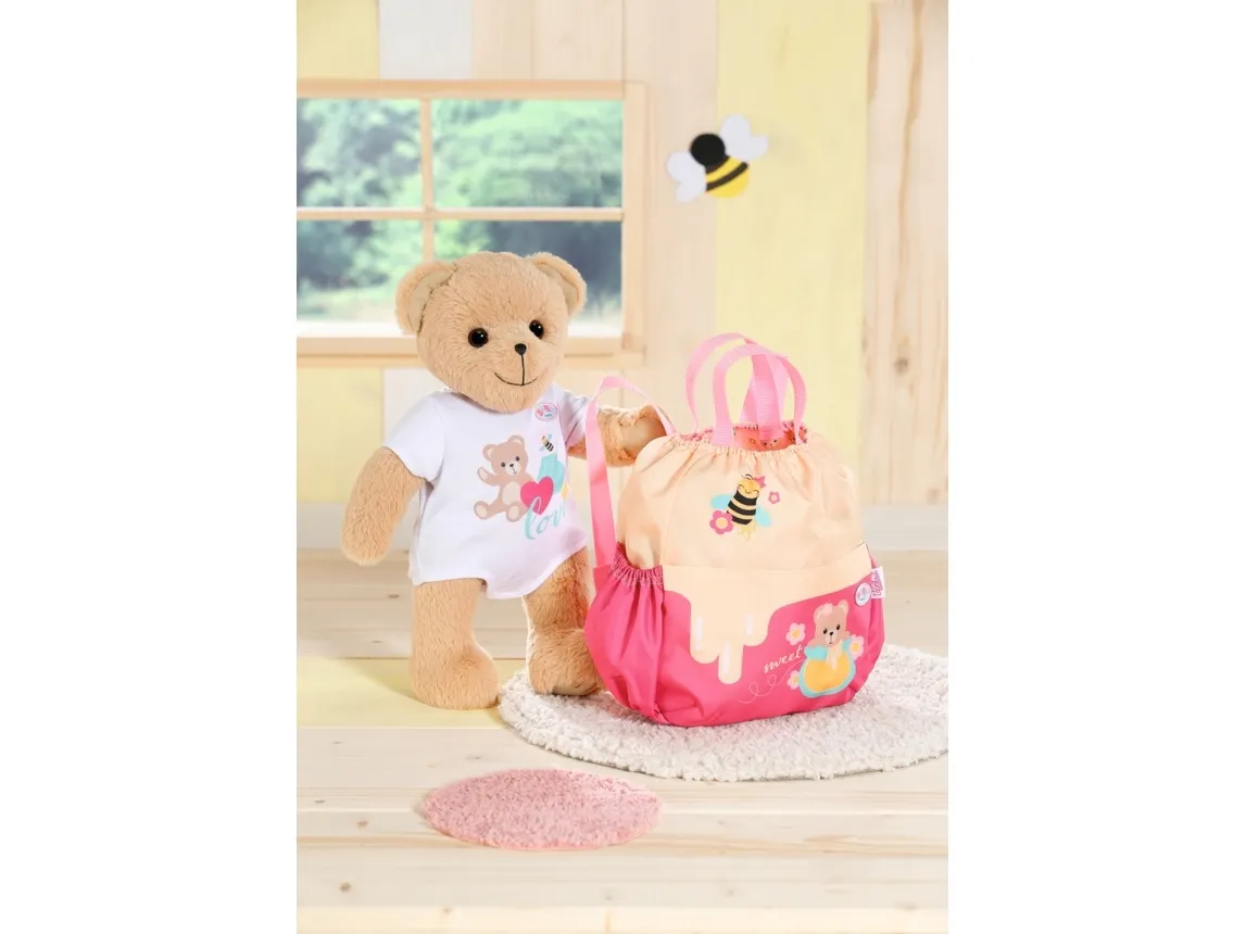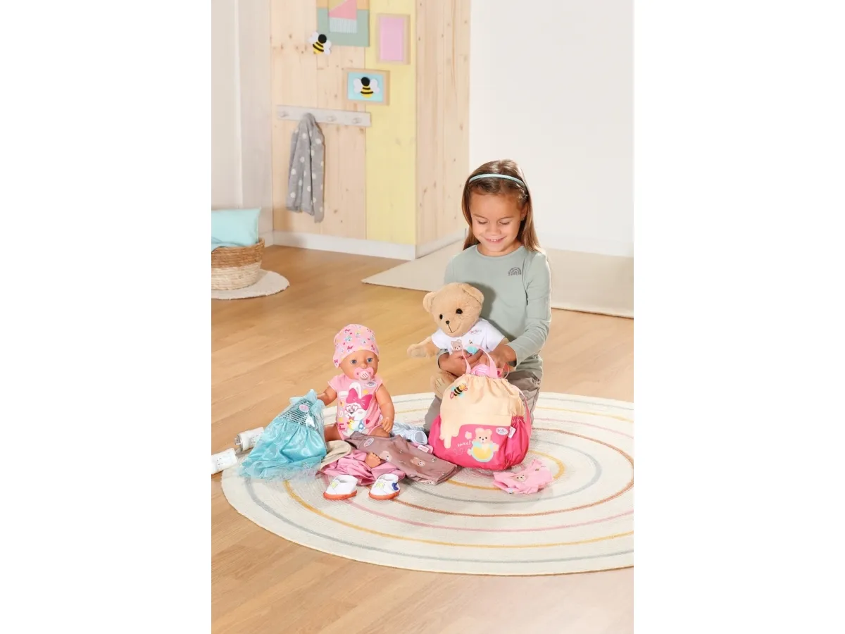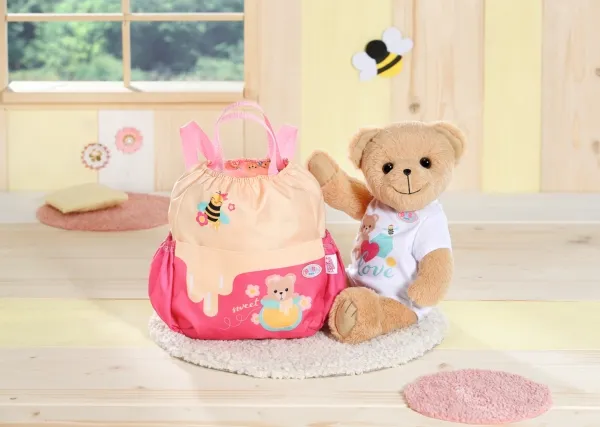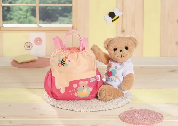 Bamsen kan sitte og se ut fra sekken. BABY born bamsen er super initiativrik. Med denne ryggsekken kan bamsen tas med overalt. Delen i honninggul og rosa er designet slik at BABY born kan titte ut under turen. I tillegg er det nok plass inne i sekken og i de to sidelommene til alt som en bamse og dens bamseforeldre trenger underveis. Det rosa selesystemet kan tilpasses ulike barnestørrelser. Høykvalitetstilbehør til BABY born bamsen og BABY born dukkene. For enda mer, variert og langvarig lekeglede. Fra 24 måneder. Inkluderer: - BABY born bamseryggsekk med justerbart selesystem