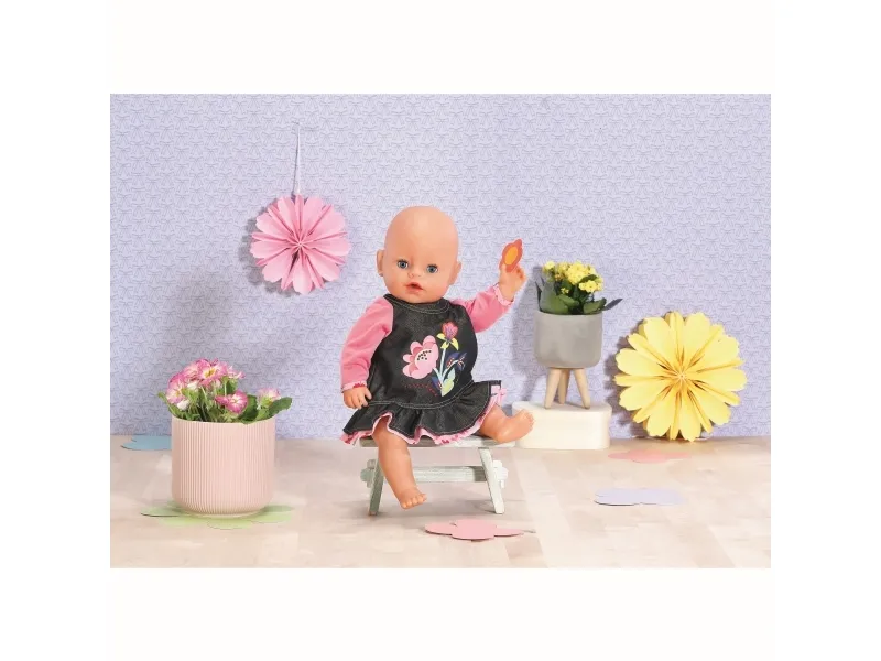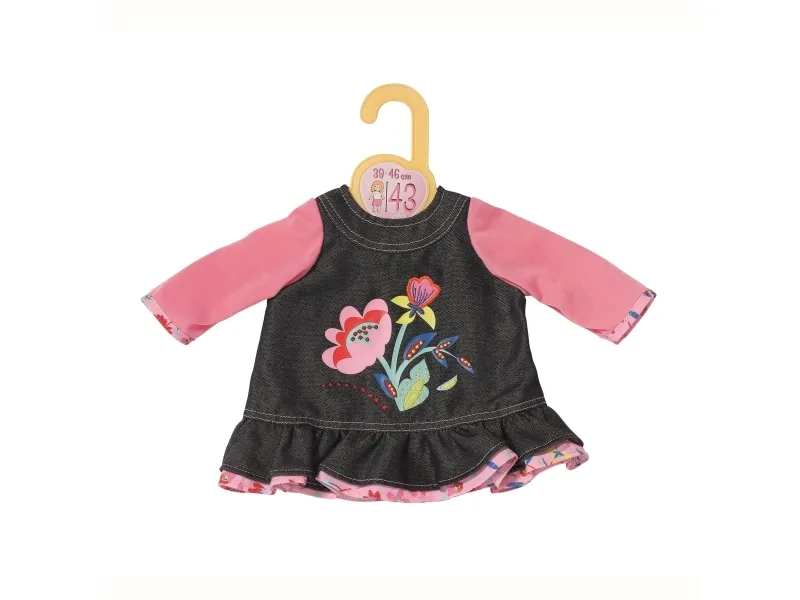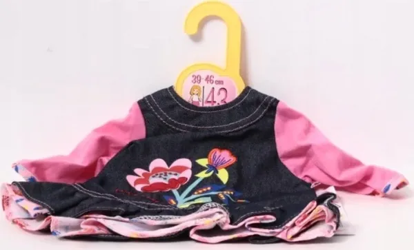 Til dukker i størrelse 39–46 cm. Blomsterbarn er best på å låne klær av hverandre. Takket være den uformelle passformen, kan BABY born, Baby Annabell og andre dukker i størrelsene 39–46 cm gjerne låne hverandres klær. Jeanskjolen med rosa ermer er et kult antrekk å ha på i barnehagen eller til og med til mer elegante anledninger. Blomsterapplikasjonen på materialet med jeanslook er spesielt vakkertt brodert. Et morsomt kronbladsmønster titter frem under volangskjørtet og ermene. Utvider mulighetene for lek, fremmer fantasien og oppmuntrer til kreativt rollespill. Fra 3 år. Inkluderer: - Dolly Moda Jeanskjole 43 cm, passer dukker i størrelsene 39–46 cm.