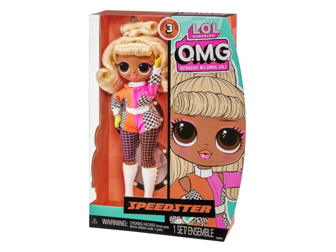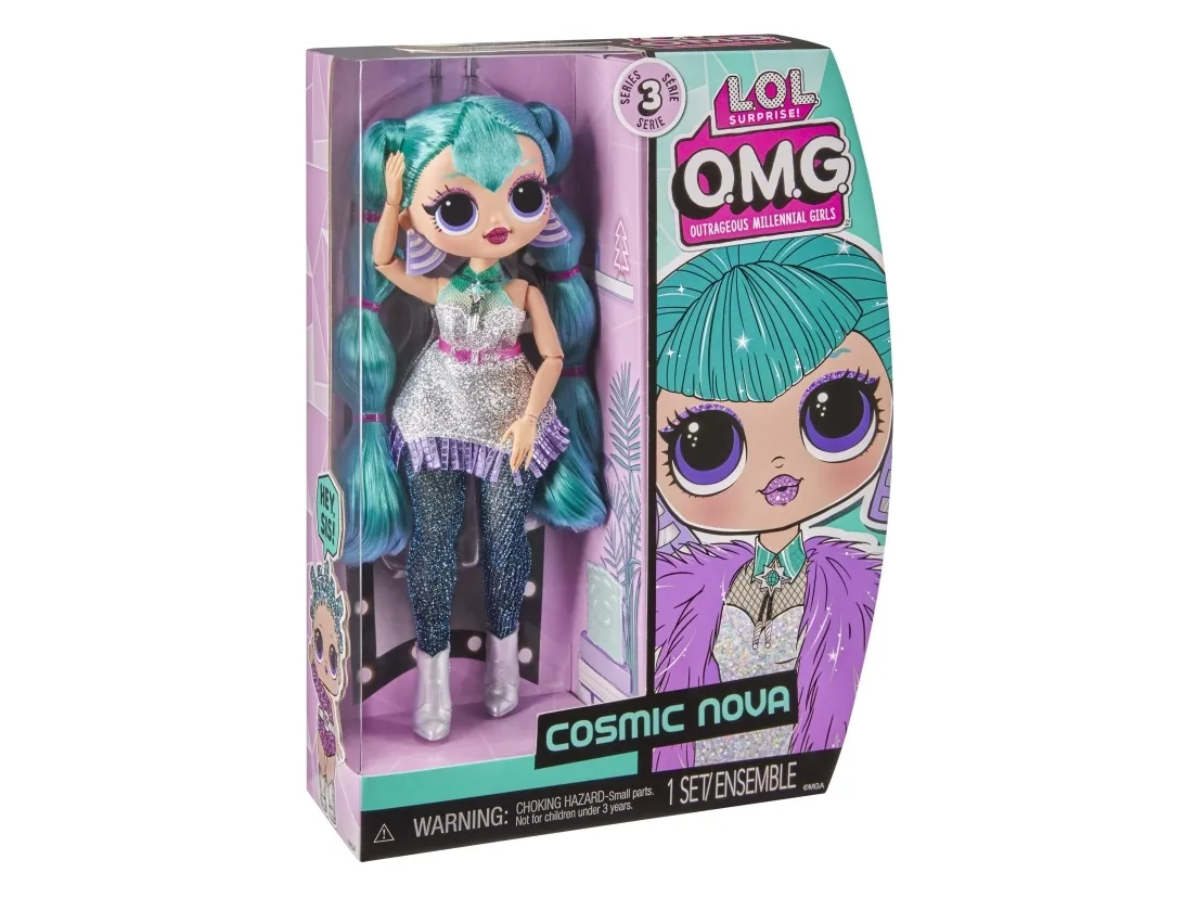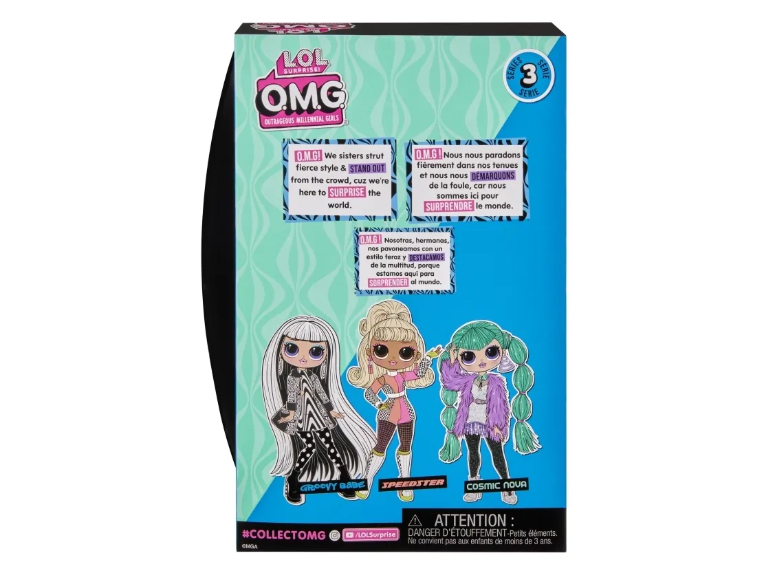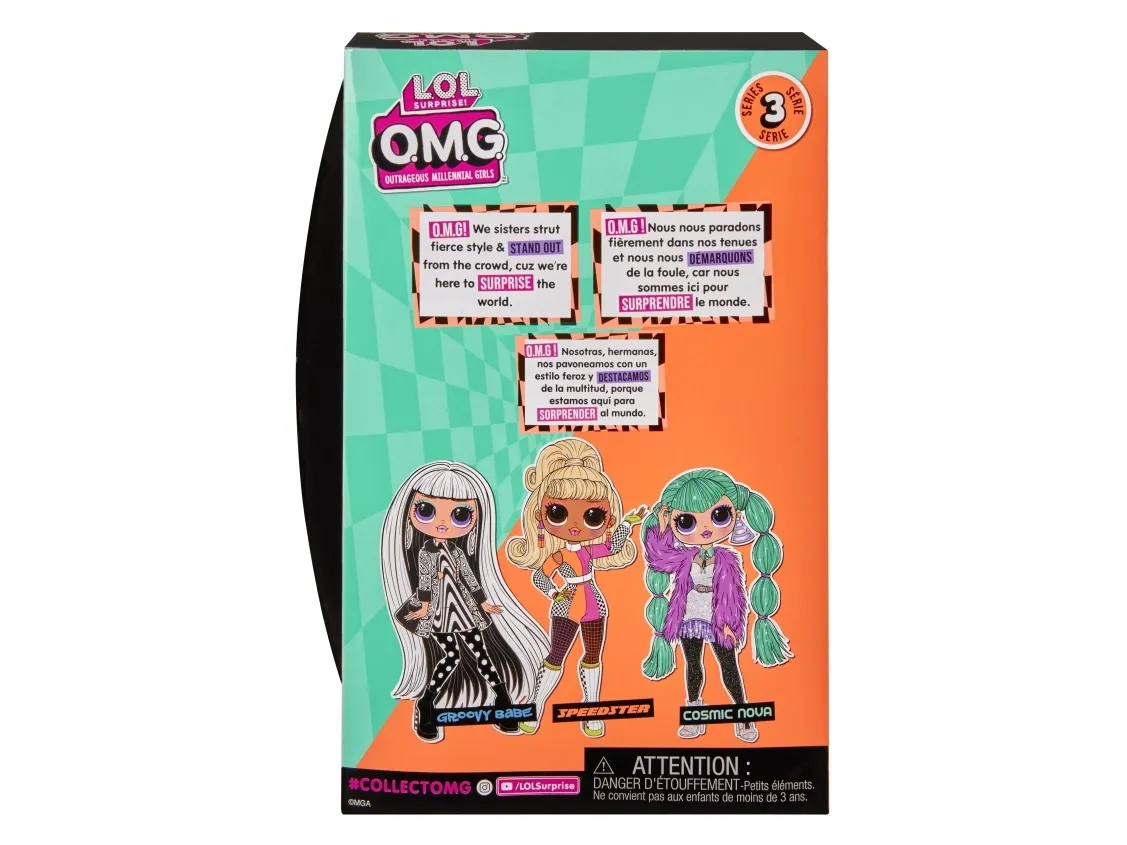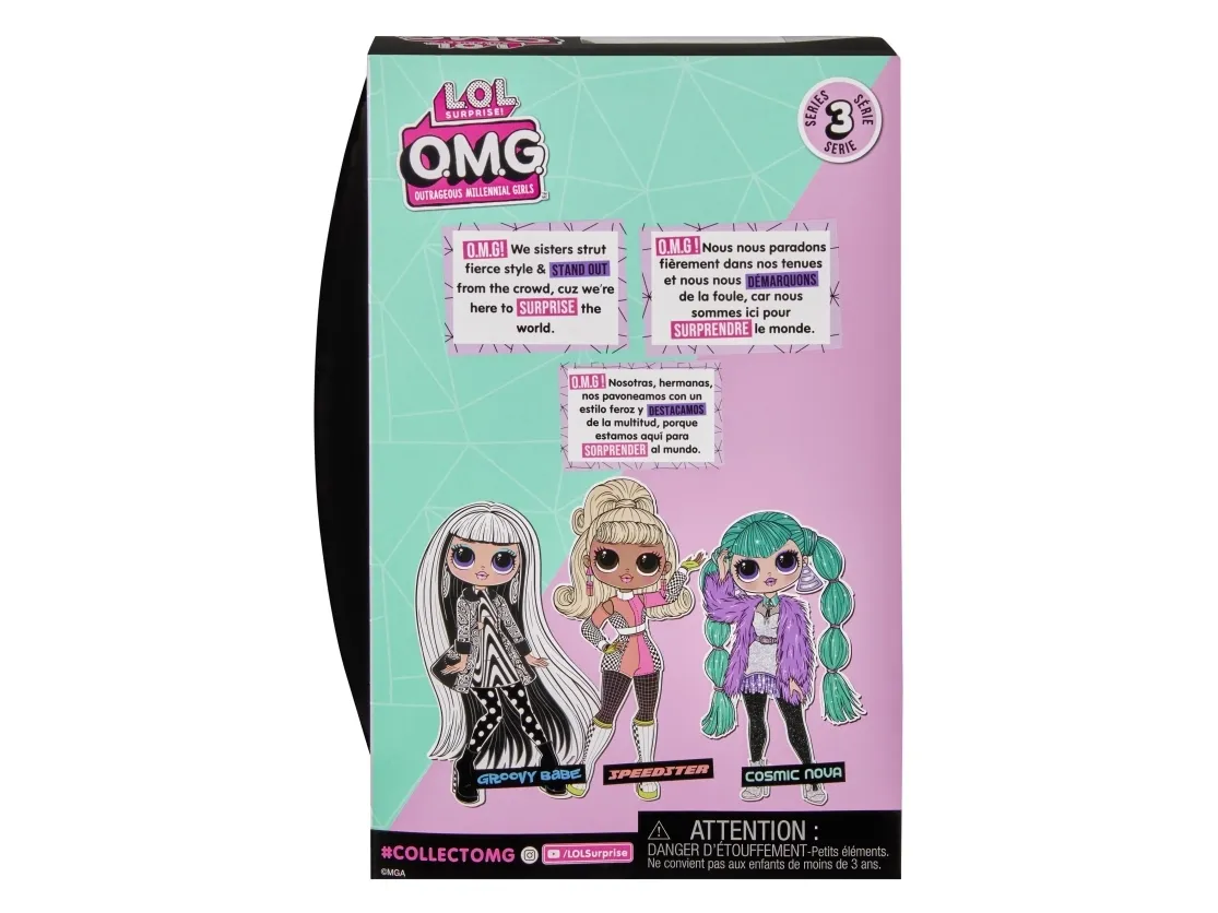De originale OMG-dukkene, kulere enn noensinne! De originale OMG-motedukkene gjør comeback – kulere enn noen gang! Dukkene har fantastiske egenskaper, fantastisk hår og sin egen fantastiske stil. Samle alle de tre relanserte dukkene i Series 3, Cosmic Nova, Groovy Babe og Speedster, som kommer i vindusforpakning. Fra 4 år. Inkluderer: - L.O.L. Surprise! OMG motedukke med ekte hår - hårbørste - dukkestativ