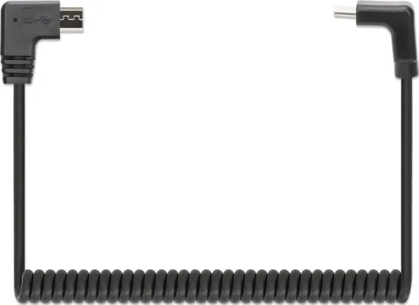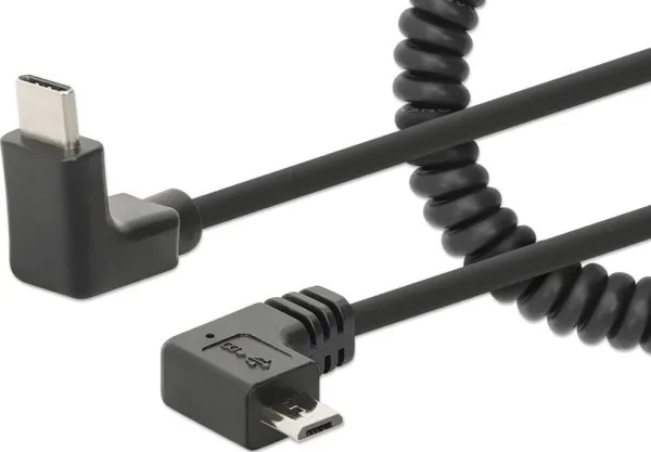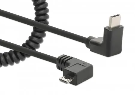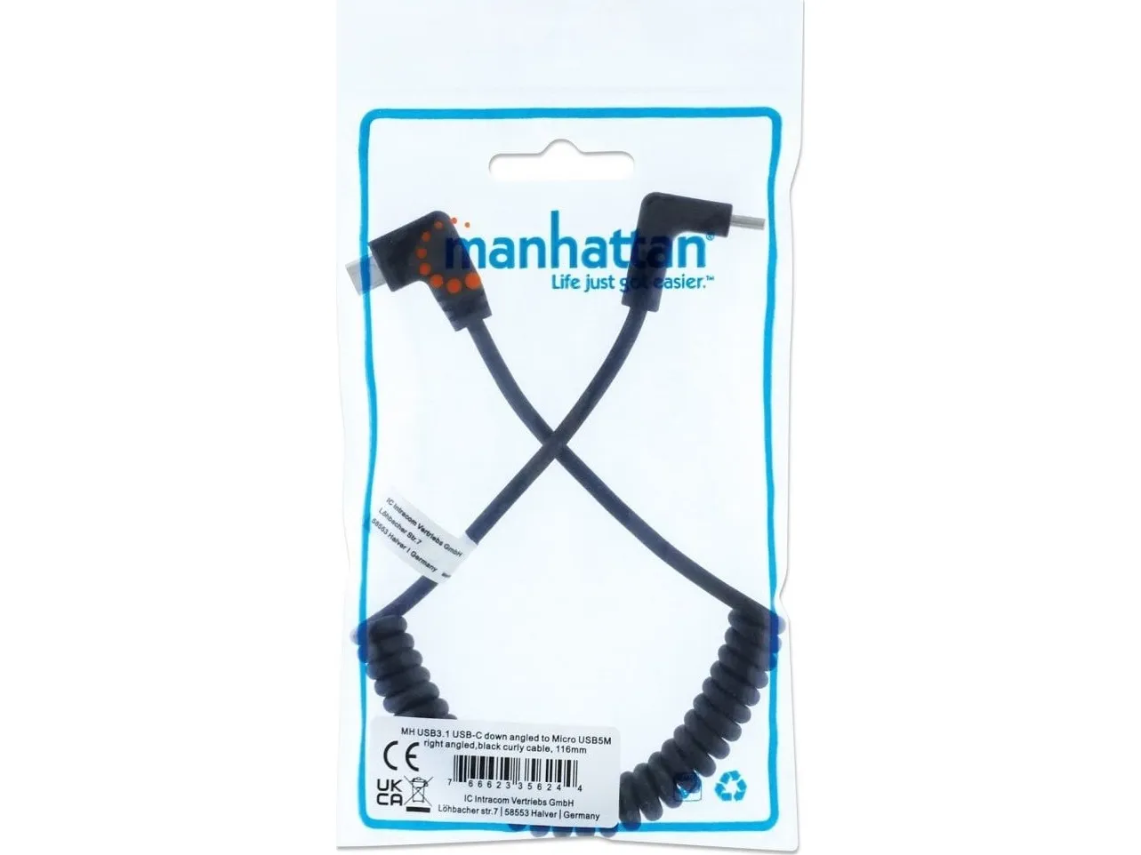 Coiled USB cable - USB C to Micro-B cable - the ideal charging cord to keep car chargers, charging cabinets, and charging carts clutter-free Make your charging cable management clutter-free with the coiled, tangle-resistant USB-C to Micro-USB Charging Cable from Manhattan. It flexibly stretches to just the right length you need without tangles and retracts back to a compact format for easy handling and storage. For even more convenience, both plugs are 90° angled for easy connection in places like tight corners or hard-to-reach ports. The reversible USB-C connector will always fit, no matter which way you insert the cable.Manhattan USB-C to Micro-USB Cable, 1m, Male to Male, Black, 480 Mbps (USB 2.0), Tangle Resistant Curly Design, Angled Connectors, Ideal for Charging Cabinets/Carts, Hi-Speed USB, Lifetime Warranty, Polybag. Cable length: 1 m, Connector 1: USB C, Connector 2: Micro-USB B, Connector contacts plating: Nickel, Product colour: Black