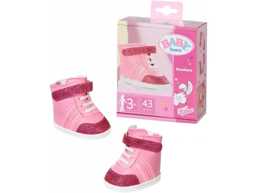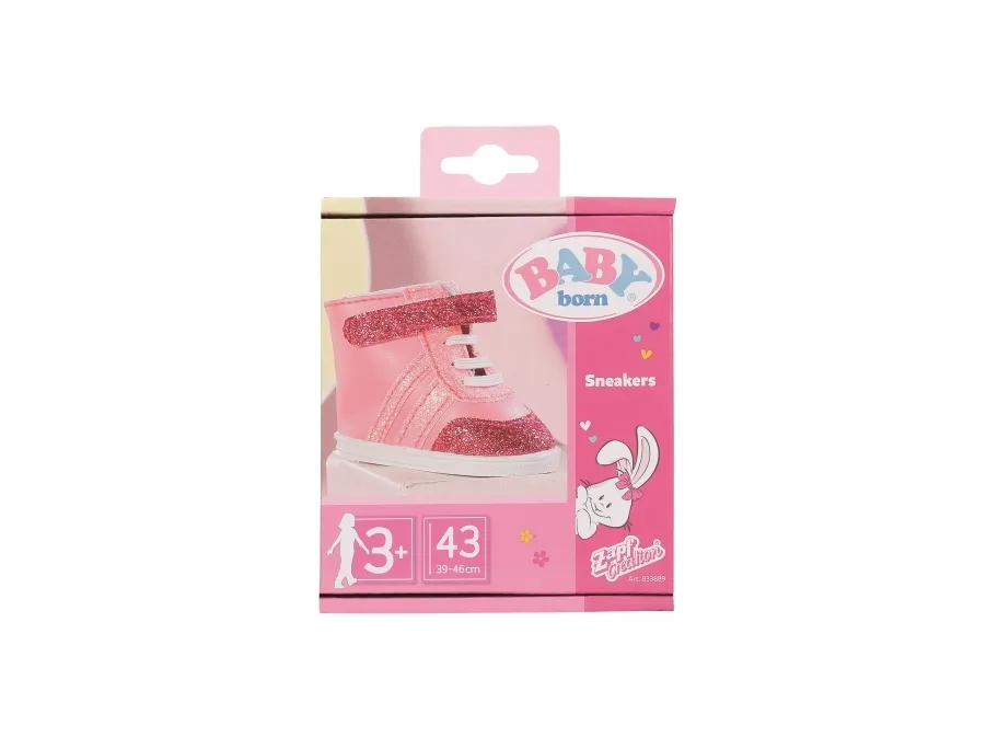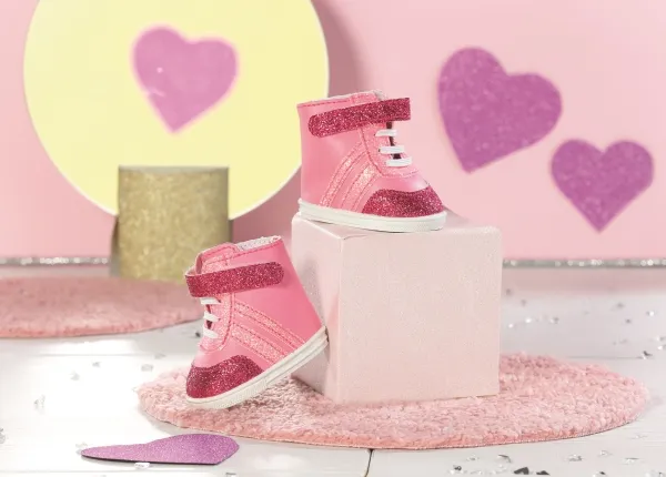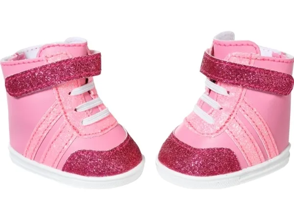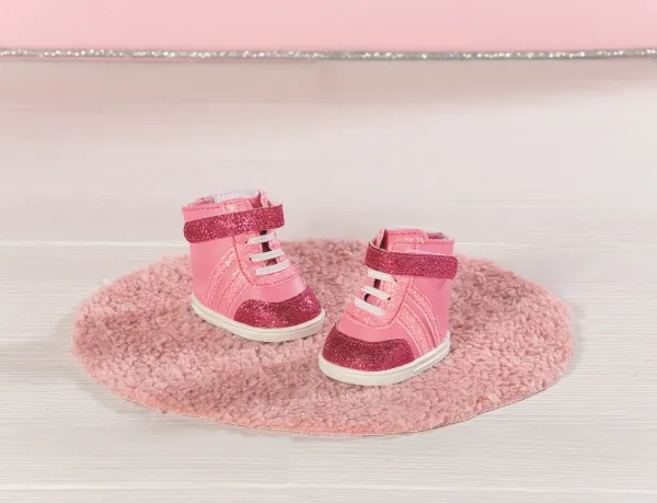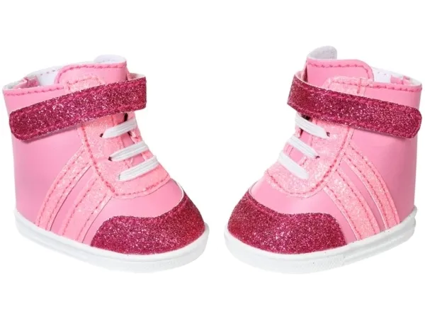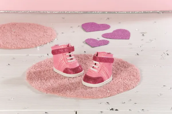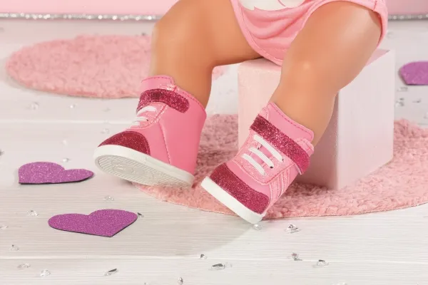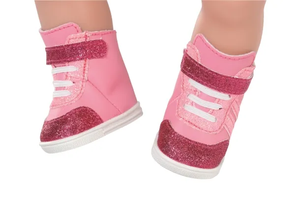 Joggesko i søte rosa fargenyanser. Nylig snuste BABY born rundt som en liten rosa panter på soverommet sitt. De stille sålene og de hvite blondene er i perfekt harmoni med joggeskoene, som er i forskjellige rosa toner. Fargen på skomaterialet, stripene, borrelåsremmen og skolissene avviker bare litt. Selvfølgelig må det være litt glitter på det rosa. Skoene er ankelhøye og gir den lille oppdageren støtte når hun er ute og ser seg rundt. Originalt kvalitetstilbehør til BABY born. Gir forbedret, variert og langvarig moro gjennom lek. Fra 3 år. Inkluderer: - BABY born joggesko rosa 43 cm