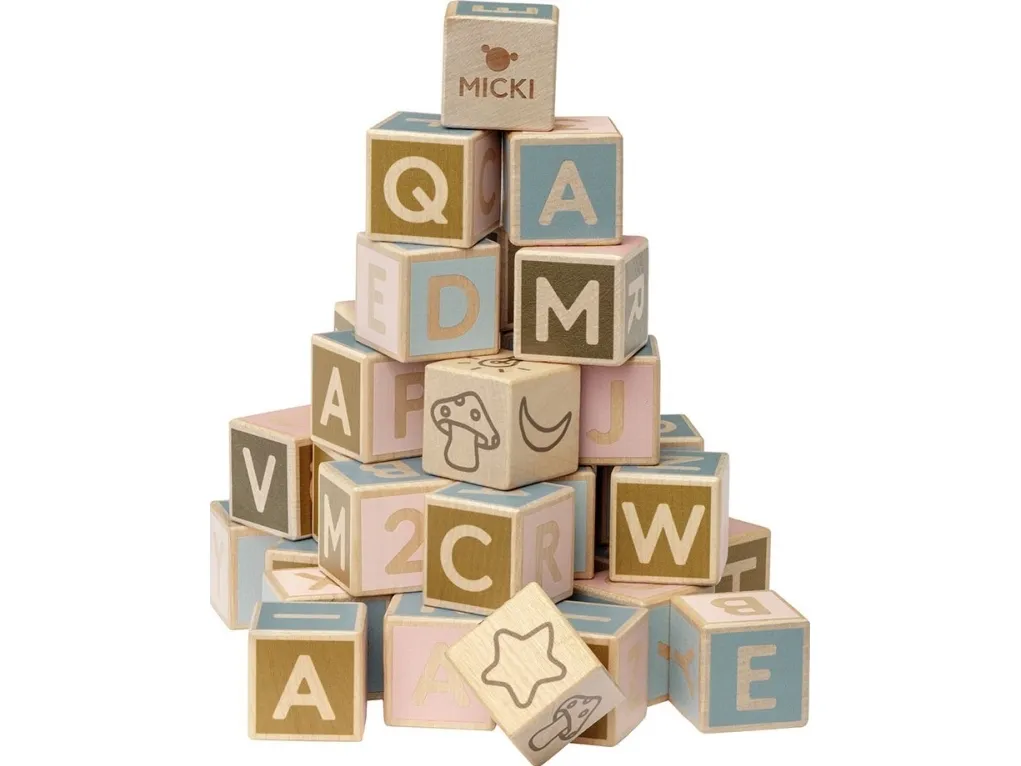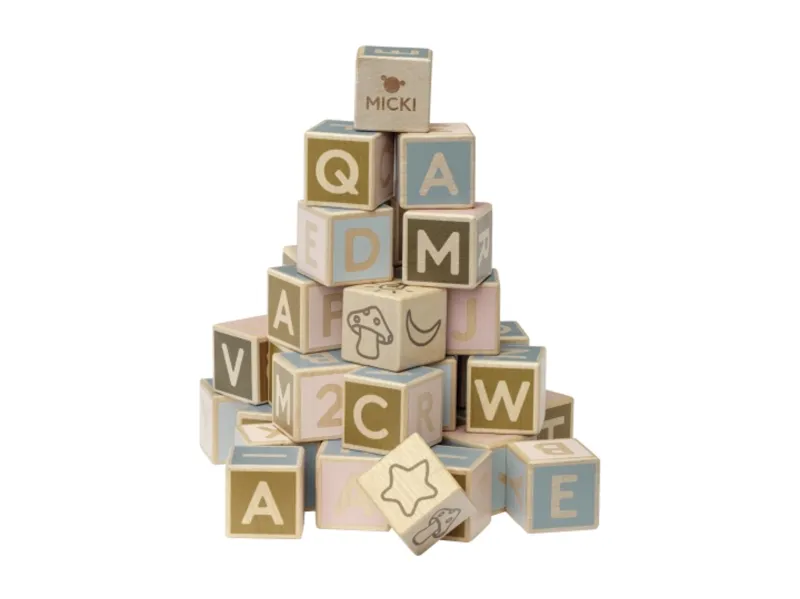 Mickis klassiske bokstavklosser av tre. Treleken hjelper barnet med å lære å stave på en leken måte. Settet inneholder 36 treklosser i forskjellige farger og inneholder alle bokstavene fra de nordiske + tyske alfabetene.