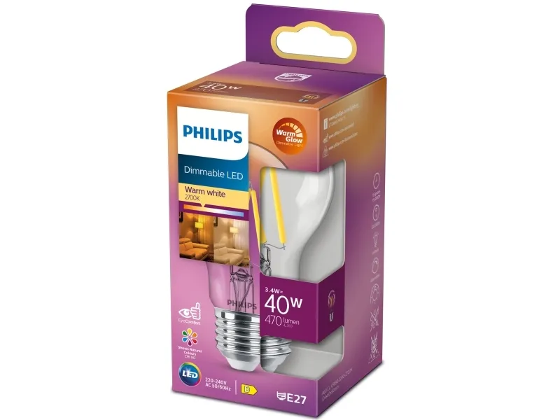 Philips - LED-filamentlyspære - form: A60 - klar finish - E27 - 3.4 W (ekvivalent 40 W) - klasse D - varmt hvitt lys - 2700 K