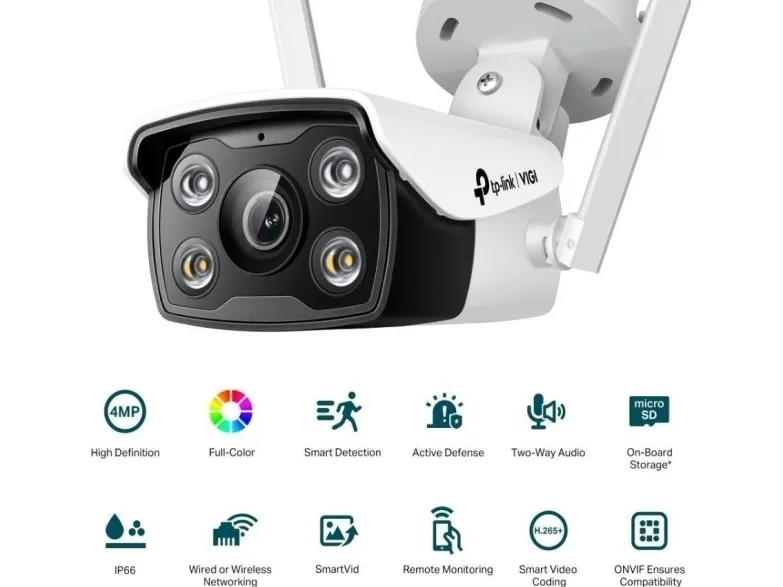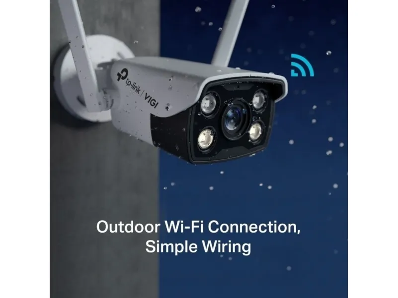 TP-Link VIGI 4MP Outdoor Full-Color Wi-Fi Bullet Network Camera. Type: IP security camera, Placement supported: Outdoor, Connectivity technology: Wired & Wireless. Mounting type: Ceiling/wall, Product colour: White, Form factor: Box. Lens viewing angle, horizontal: 79°, Lens viewing angle, vertical: 43°, Lens viewing angle, diagonal: 93°. Sensor type: CMOS, Optical sensor size: 25.4 / 3 mm (1 / 3"). Night vision distance: 30 m