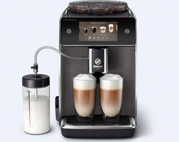 Featuring a 1.8-liter water tank and a 300 g coffee bean container, the GranAroma Deluxe is designed for convenience and efficiency, ensuring it can handle both busy mornings and leisurely coffee breaks. The integrated cappuccinatore and availability of hot water spouts add versatility, while dishwasher-safe components, including the drip tray and milk container, provide effortless cleaning and maintenance. With Wi-Fi connectivity and smartphone compatibility, this machine is tailored for those who appreciate quality and innovation in their coffee-making routine.