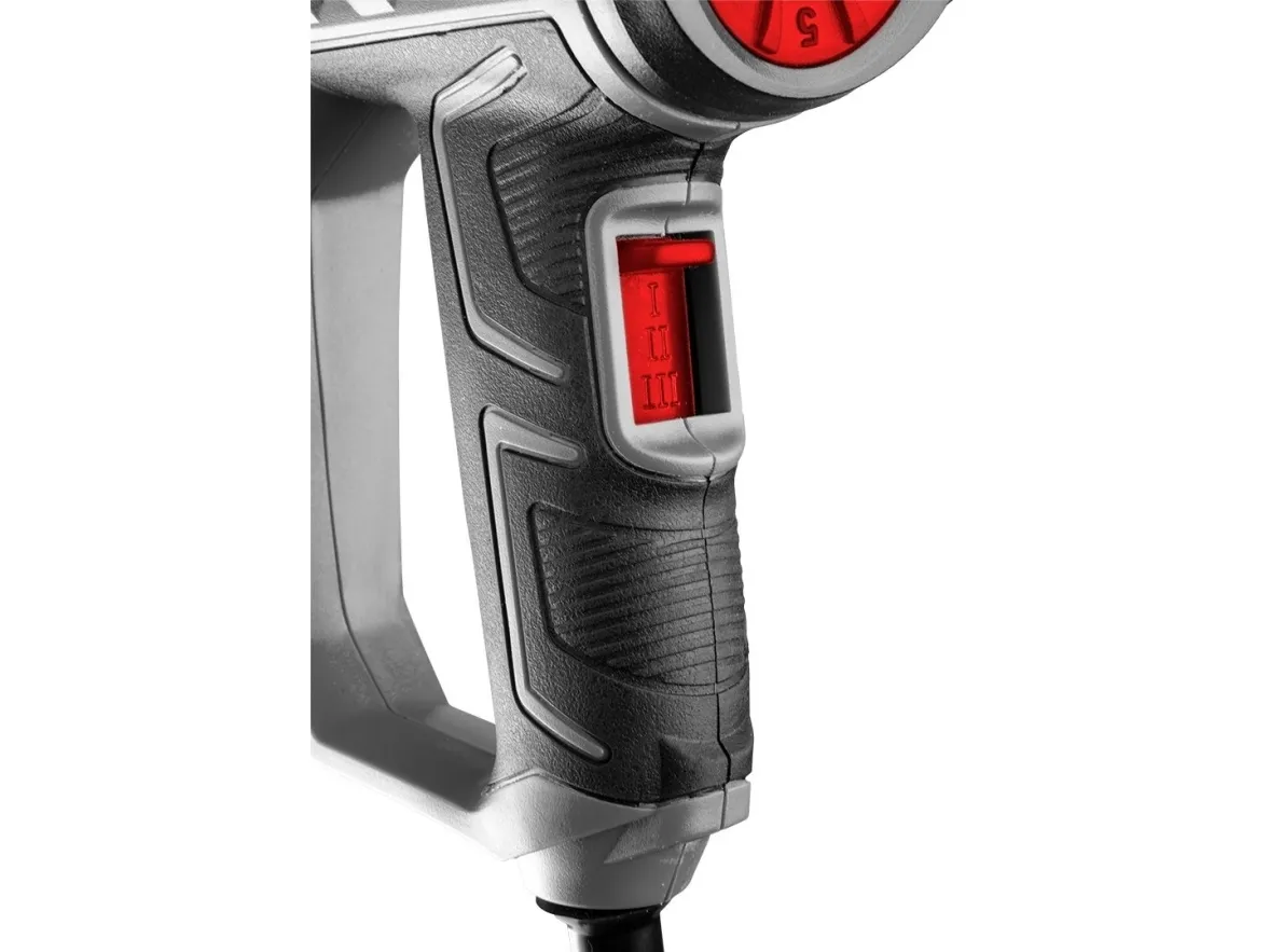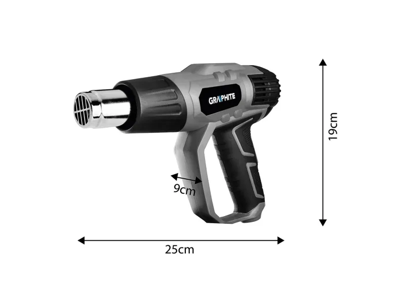 Tanner 2000 W, I: 50°C, II: 50-550°C, case 59G526 by GRAPHITE is a high-powered 2000 W tool. It works in temperature ranges I - 50°C, II - 50-550°C, III - 50-550°C. It offers an air flow of 350 - 500 l/min. The unit has a light weight of 0.7kg and a handy design for vertical operation. The included convenient 3m cable allows the tanner to be manoeuvred freely. Stepless temperature adjustment is possible in 2nd and 3rd gear. This tool is designed primarily for paint stripping, bending, welding thermoplastics, defrosting, drying and veneering furniture components. A tanning machine dedicated to professional and industrial applications, indoors and outdoors. The included accessories - 4 nozzles, a scraper with handle and a carrying case - increase the possibilities of this device.Graphite 59G526. Depth: 250 mm, Weight: 2.04 kg. Quantity per pack: 1 pc(s)