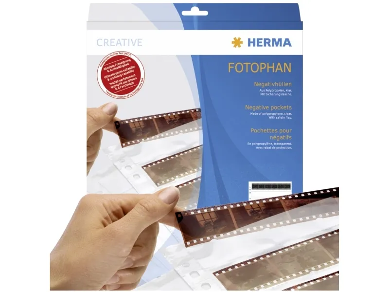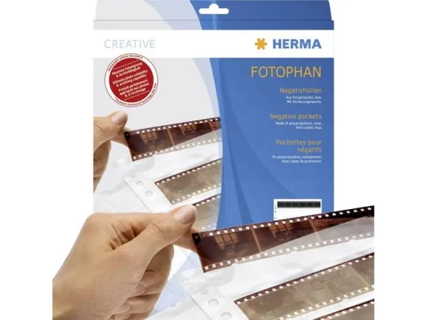 - Negative pockets for perfect protection against dust and fingerprints. The safe way to archive valuable negatives. Fully transparent, in clear polypropylene. Safety tab prevents negatives from falling out. Indexes for filing included. Laboratory-tested - free from plasticizers and archive-safe. With Euro-standard holes, suitable for HERMA ring binderalbums and all standard files.
