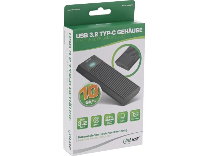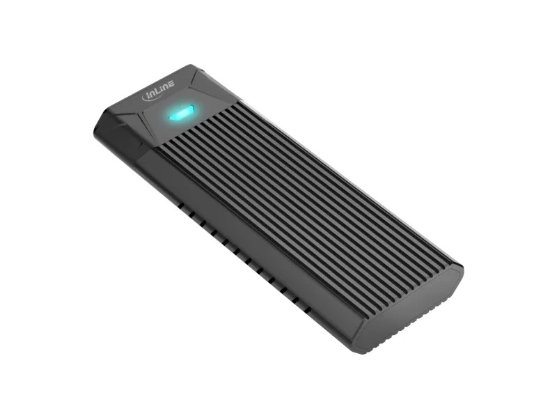 This M.2 enclosure supports application of a PCIe NVMe M.2 SSD or SATA M.2 SSD in 2242 / 2260 / 2280 size format. Contains cooling fins at both sides to ensure an optimum temperature of the enclosure at work. The key feature of this M.2 enclosure is that both SATA and PCIe (NVMe) M.2 SSDs can be installed into the enclosure. The memory is automatically detected by the built-in chipset and can then be used in accordance. No tools are required to install the M.2 SSD.InLine USB3.2 Gen.2 USB-C to M.2 SSD (PCIe NVMe & SATA) Enclosure. Product type: SSD enclosure. Number of storage drives supported: 1, Storage drive size: M.2. Data transfer rate: 10 Gbit/s. Product colour: Black. USB connector type: USB Type-C