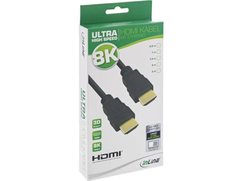 Gold-plated contacts The gold-plated plugs improve the conductivity, durability and corrosion resistance of the InLine HDMI cable. The risk of oxidation or corrosion is significantly reduced. This increases the long-term reliability of the connection, e.g. even in environments with higher humidity. Gold-plated contacts adapt better to the connections and are less susceptible to abrasion and damage when plugging and unplugging. In addition, the higher conductivity can improve signal transmission and therefore picture and sound quality, especially over longer cable runs.InLine Certified HDMI Cable, Ultra High Speed HDMI, 8K4K, 2m. Cable length: 2 m, Connector 1: HDMI Type A (Standard), Connector 1 gender: Male, Connector 2: HDMI Type A (Standard), Connector 2 gender: Male, Connector contacts plating: Gold, HDMI version: 2.1, 3D, Data transfer rate: 48 Gbit/s, Audio Return Channel (ARC), Product colour: Black