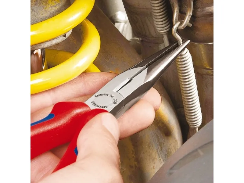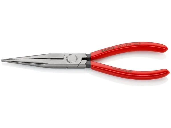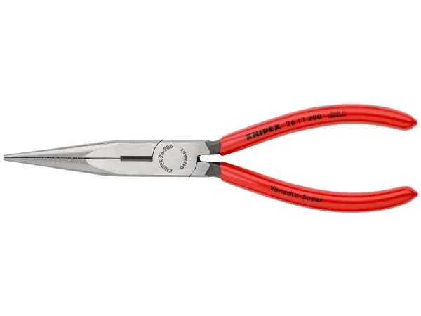 26 11 200 SB Fladrundtang med skær flad-runde, lange och spidse kæber. vridningstolerante, elastiske præcisionsspidser. velegnet til gribe- og skærearbejder. Med skær til blød, mellemhård og hård tråd. Skær yderligere induktivt hærdede, skærhårdhed ca. 61 HRC. lige kæber.