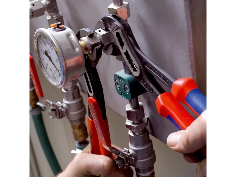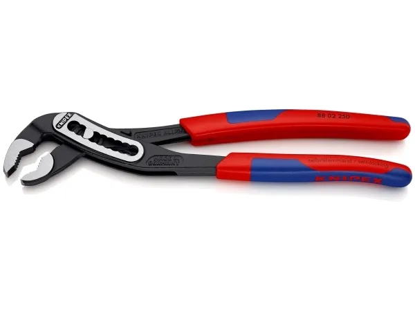 88 02 250 SB KNIPEX Alligator® Selvspændende på rør og møtrikker: ingen glidning på emnet, energibesparende arbejde. Gribeflader med specialhærdede tænder, tændernes hårdhed ca. 61 HRC: vedvarende sikkert greb pga. høj slidstyrke. Gennemstukket led: høj stabilitet pga. dobbelt føring. Robust konstruktion, ufølsom mod tilsmudsning, særligt velegnet til arbejde udendørs. Klembeskyttelse forhindrer sammenklemningskvæstelser. med slanke flerkomponent-håndtag uden krave for bedre håndtering og nemmere transport.