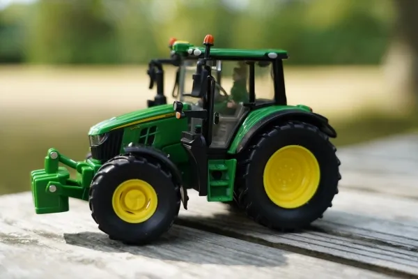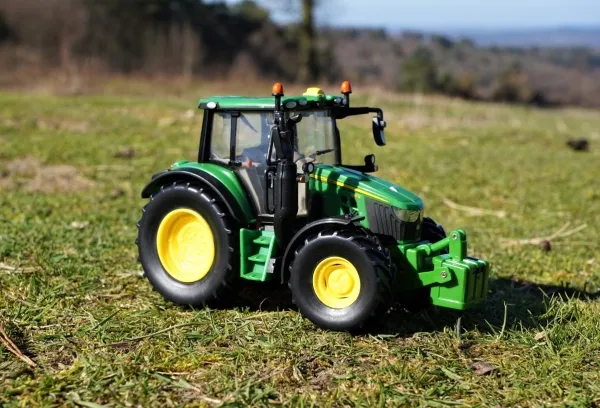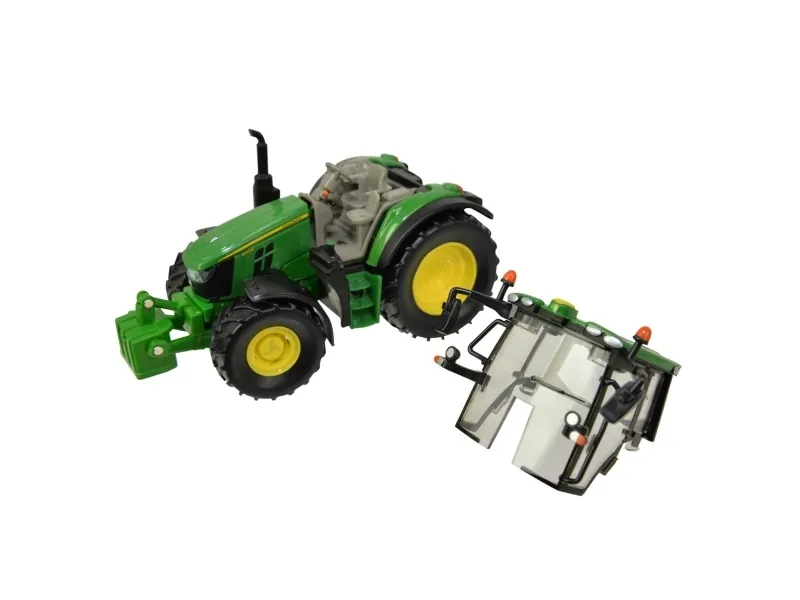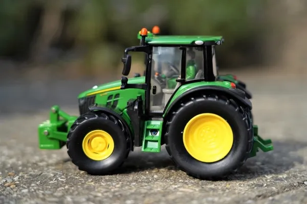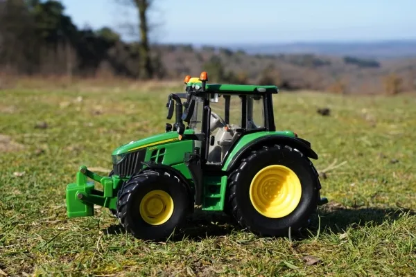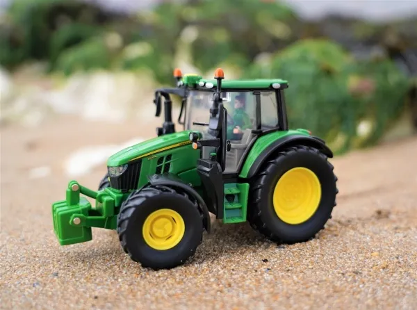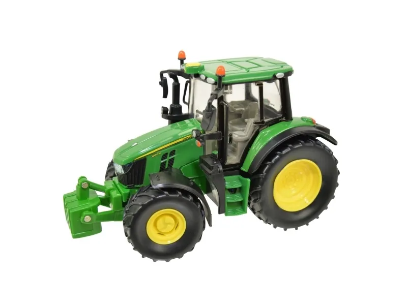 Selected from the new 6M series from John Deere, the 6120M has a brand new cab with ultimate visibility, strong engine performance with a John Deere 4.5 l engine, amazing total performance with strong hydraulics and the short wheelbase with their compact build, and with a best-in-class payload of 4.7 tons, they won’t break a sweat with heavy implements. The Britains model doesn’t stint on detail: removable cab where you can drop your sitting drivers (sold separately), working steering and an A-frame front hitch. It’s one of a range of 1:32 scale models built of die cast metal and plastic. Suitable for indoor and outdoor play, for kids and collectors aged 3+.