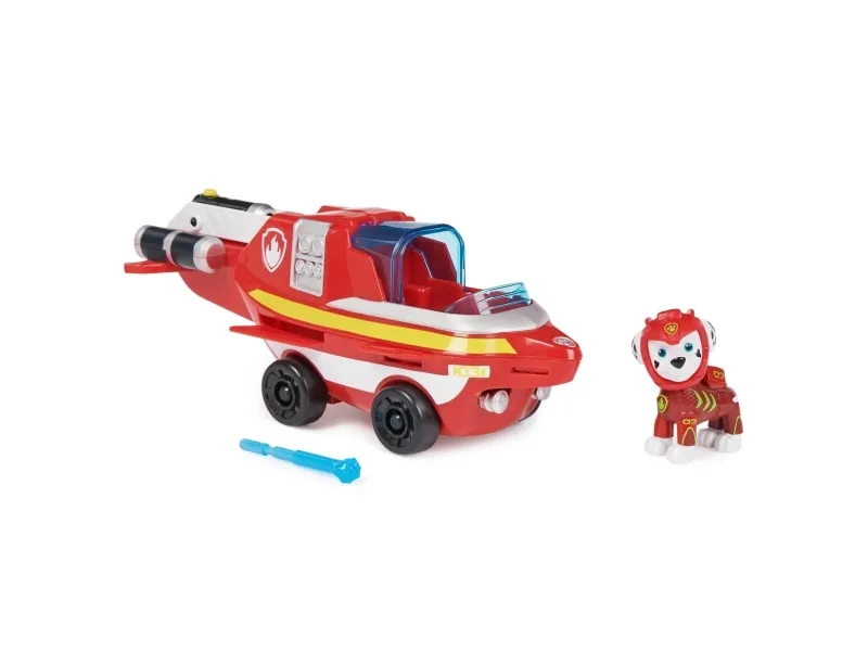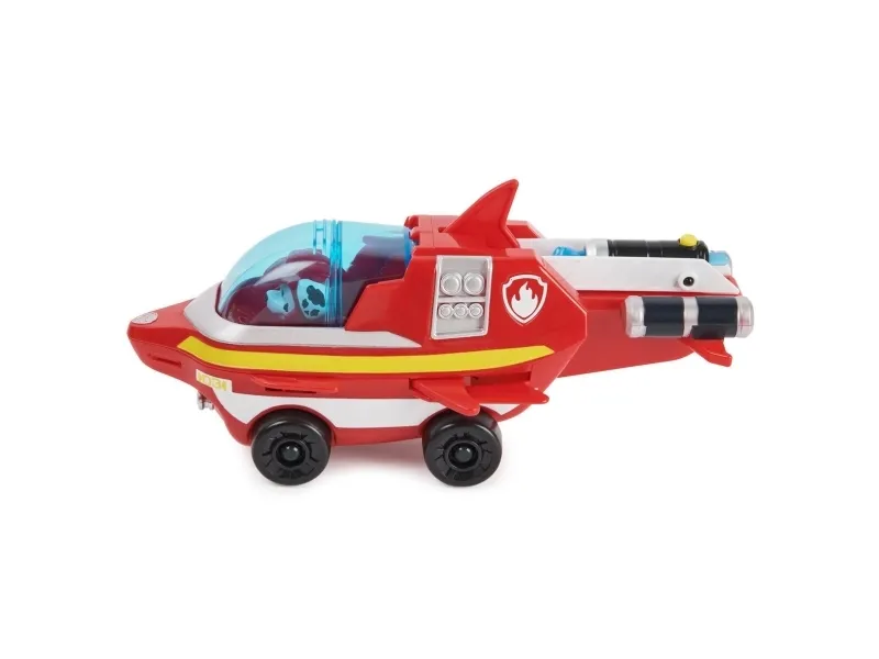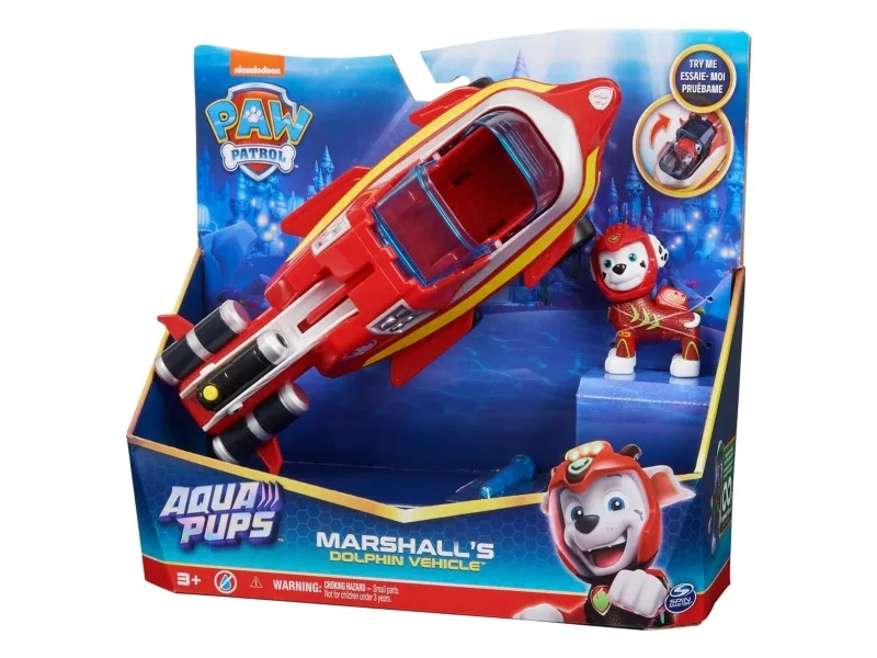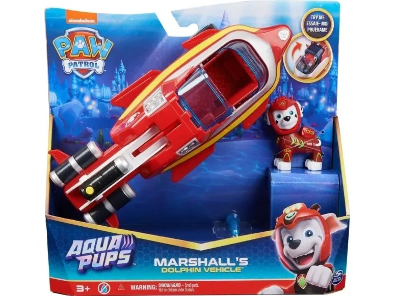 Slå deg sammen med Marshall for noen actionfylte redningsoppdrag i hans Aqua Pups – Dolphin Rescue Vehicle! Med sin røde aqua pups våtdrakt og hjelm er Marshall klar for superladede redninger i late som havet! Marshalls Dolphin Vehicle har en spennende transformasjon! Bare plasser Marshall i kjøretøyets cockpit og skyv baldakinen igjen, for å koble inn vingene og ryggfinnen, og forvandle kjøretøyet til redningsmodus! Når det er problemer, last prosjektilet inn i utskytningsrampen og trykk på knappen for å starte! Lag PAWsome eventyr med Marshalls Dolphin Rescue Vehicle! Deretter, for enda mer spennende serieinspirerte oppdrag, samle alle Aqua Pups-figurene og leketøyskjøretøyene (selges separat) for endeløse timer med actionfylte eventyr! Med PAW Patrol-leker kan barna utforske fantasien og utvikle motoriske ferdigheter, gjennom late-som lek, mens de vekker favorittscenene sine fra showet til live! PAW Patrol actionfigurer, lekebiler, lekesett og kosedyr er de perfekte lekene for gutter og jenter fra 3 år og oppover, så ta med hjem spenningen til PAW Patrol: Aqua Pups!