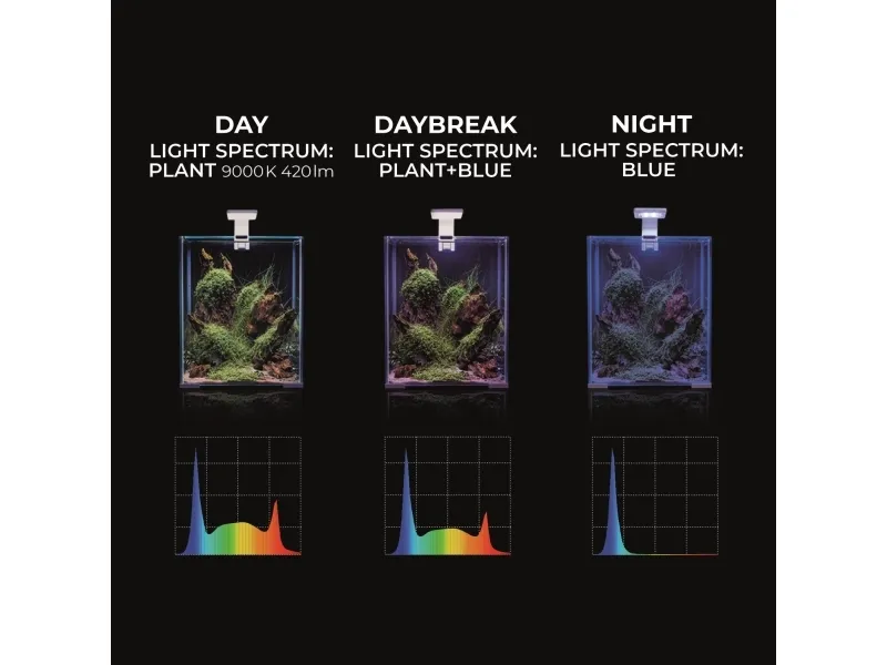 Modern och kompakt LED belysning för mindre akvarier. Lampan har Day & Night funktion så att du kan välja ett av de tre ljuslägena beroende på behov. Upp till 50000 timmars lystid. Kan monteras på alla glas upp till 4mm tjocklek.