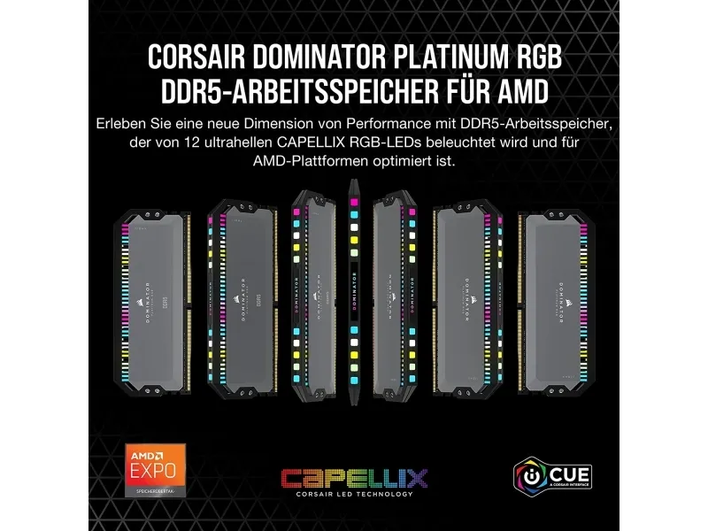 Aluminiumsvarmefordeler, Corsair iCUE-støtte, 12 ultralyse individuelt adresserbare CAPELLIX RGB LED-er, innebygd overklokking Power Management IC (PMIC), AMD EXPO