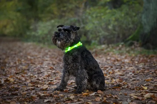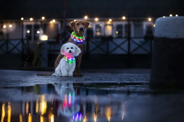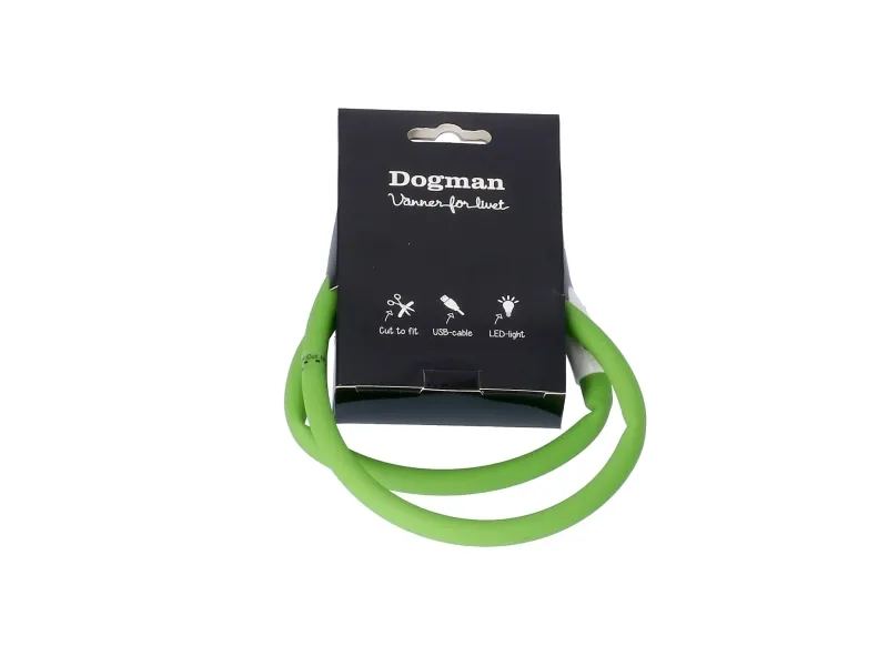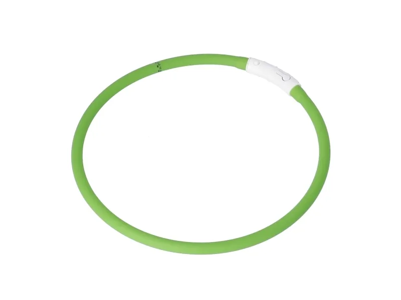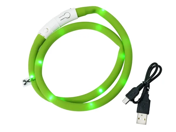 Blinkande regntåligt silikonband. Laddas via USB (sladd medföljer) Håller upp till 5h i blinkande läge, 2h vid fast sken. Välj om det ska blinka fort, sakta eller ha fast sken. Synligt upp till 500m. Kan kortas på längden så att den passar din hund. En storlek - Cut to fit.