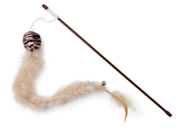 Kattepinne med brun flecball og lang fjærhale med nål. Leken inneholder kattemynte.