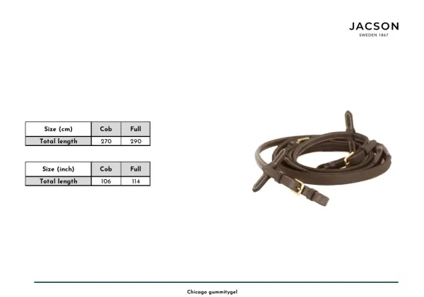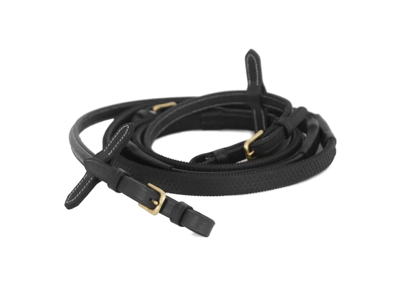 Mjuk och följsam gummitygel med bra grepp i vegetabiliskt garvat läder. Spännen i mässing och ljusa dekorsömmar.
