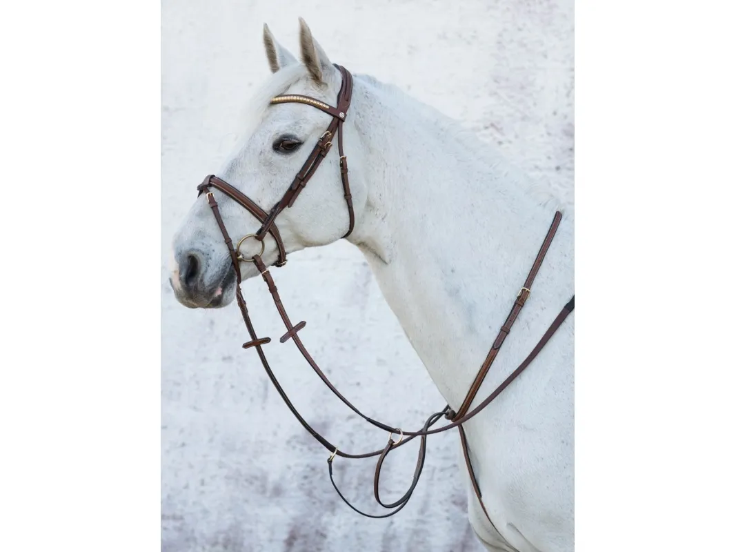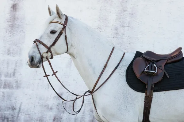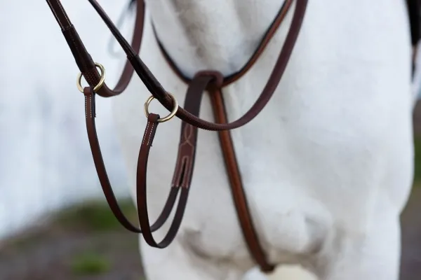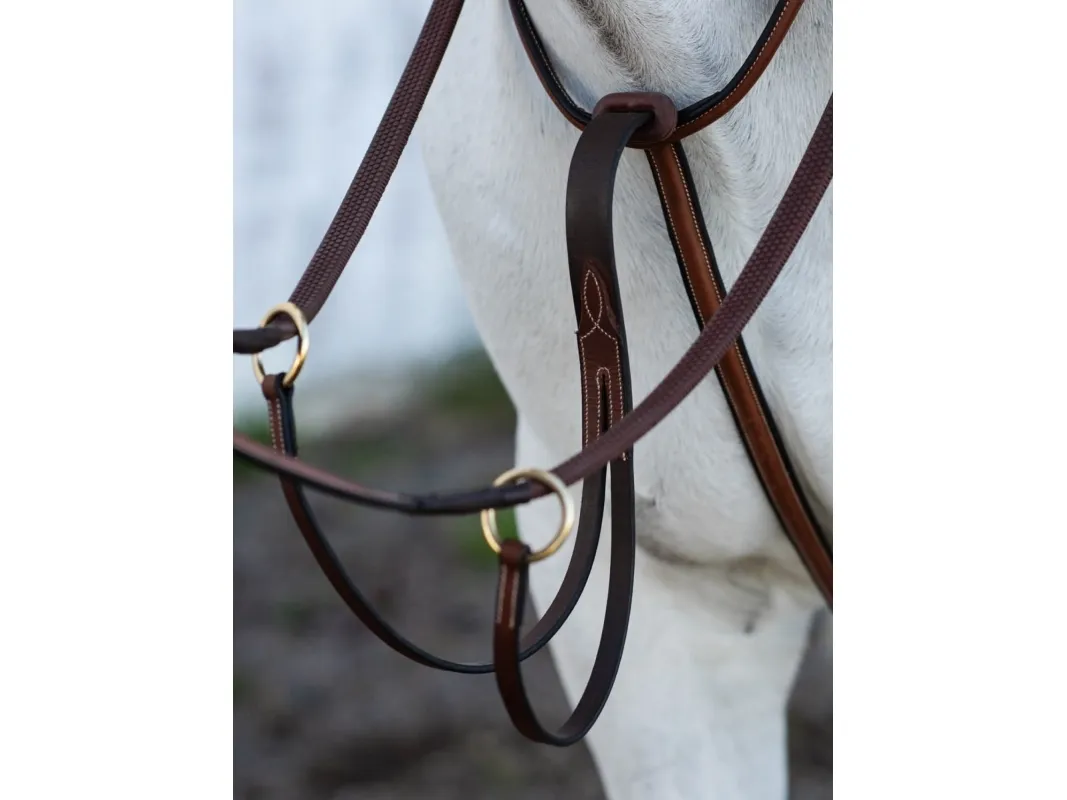 Martingal i mjukt, oljat, vegetabiliskt garvat läder. Fästes i sadelgjorden med pistolhake. Ljusa dekorsömmar och spännen i mässing.