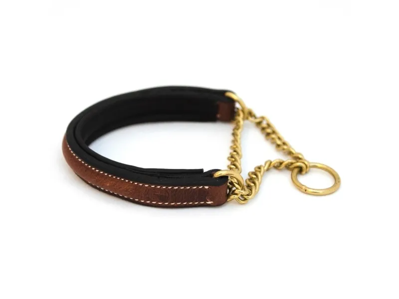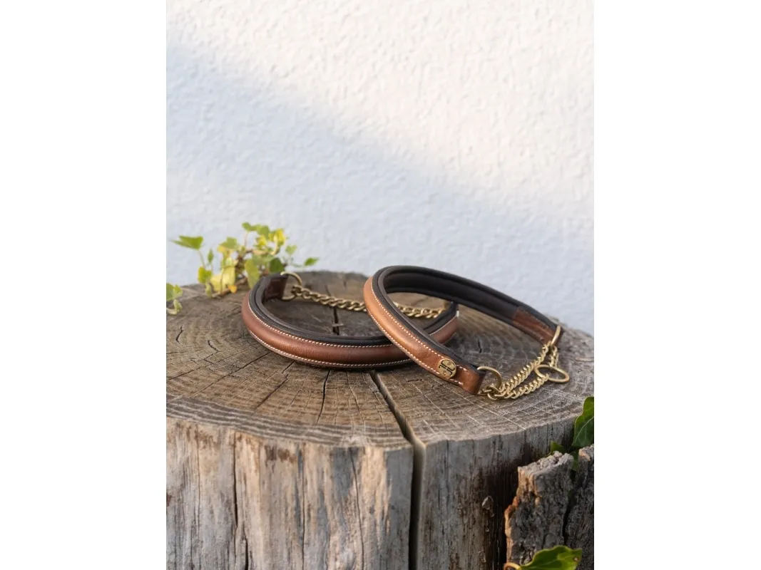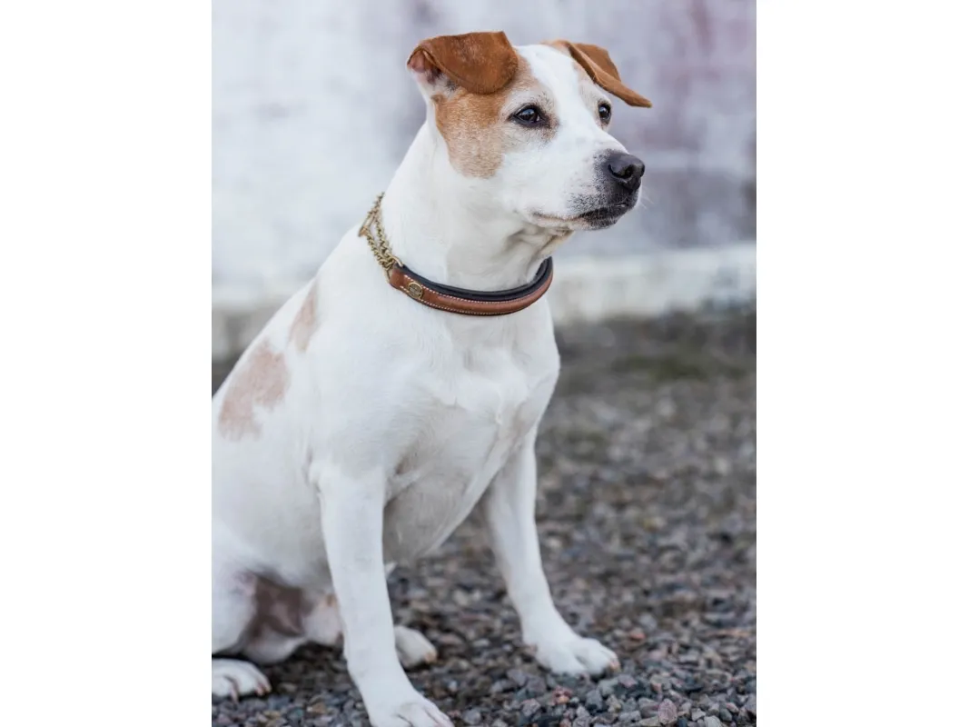 Hundhalsband i mjukt oljat vegetabiliskt garvat läder. Mjukt och skönt foder på insidan och ljusa dekorsömmar. Asti hundhalsband har halvstryp med kedja i mässing.