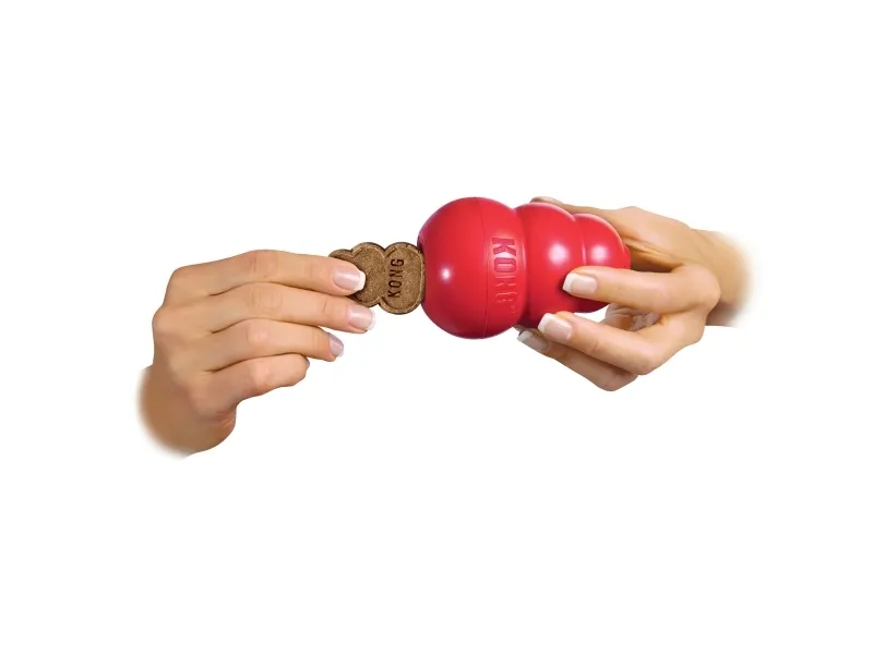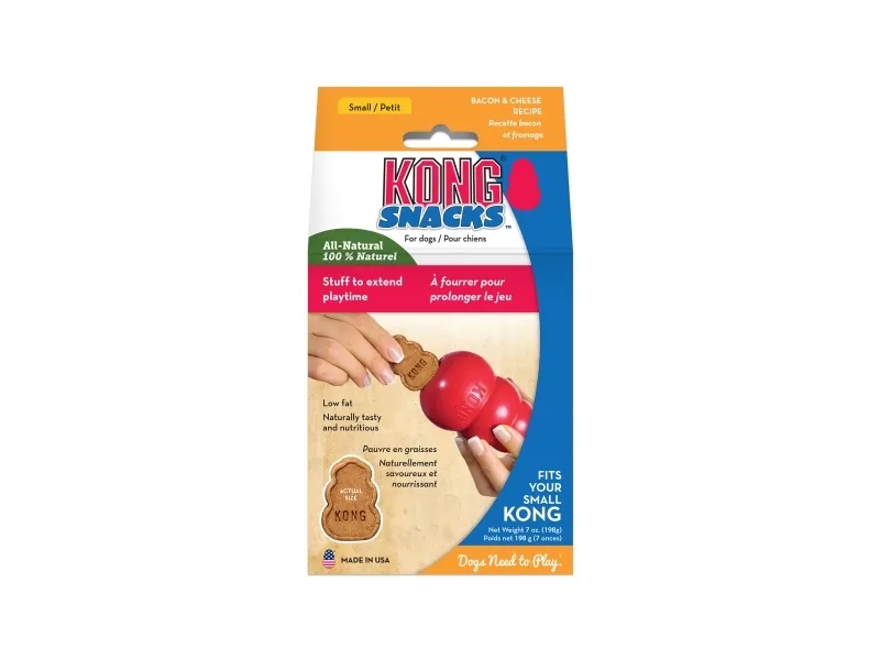 Smaskigt hundkex med utsökt smak av bacon och ost för fyllning av Kongs gummileksak Classic S. Håller din hund sysselsatt länge! Ges som belöning vid sidan av en balanserad kost. Fri från vete, majs och soja.