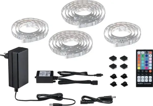 Spektakulære lyseffekter i boligen, MaxLED 250 TV-Comfort-sættet RGBW med Power Supply, LED-Stripes og fjernbetjening sørger for en indirekte belysning bag fjernsynet. Den komfortable styring muliggør legende let direkte valg af farve eller indstilling af et behageligt lys med de ekstra varm-hvide LED. Praktisk: Med sin egen strømforsyning kan lyset også tændes uafhængigt af TV'et. Sættet er med sine stripafdelinger og de filigrane hjørner specielt designet til et 75 tommer TV. Fleksibel til enhver kabinetform: Den ekstra lange ledning og mulighed for at forsyne alle hjørner - eller mellem de enkelte stripes - giver mulighed for komfortabel udlægning på kanten af TV-bagsiden. Med klæbestribe og stiksystem er monteringen meget let og kan udføres uden værktøj.