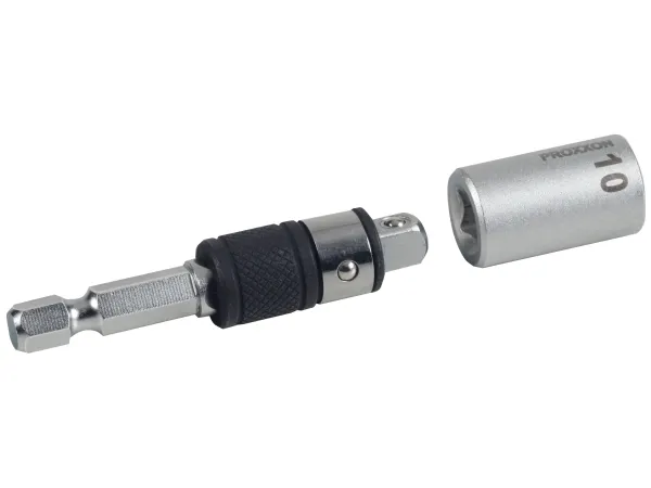 Kombi-adapter 1/4 Anvendes til batteri- og elektroskruenøgler · 1/4. Proxxon kombi-adapter med 1/4-firkant og 1/4-bit-optagelse. Til optagelse af 1/4-firkant-toppe og 1/4-sekskant-standard-bits (6,3 mm). Udskiftningen af holderen sker ved ganske enkelt at skubbe optagehylstrene. Anvendes til batteri- og elektroskruenøgler.