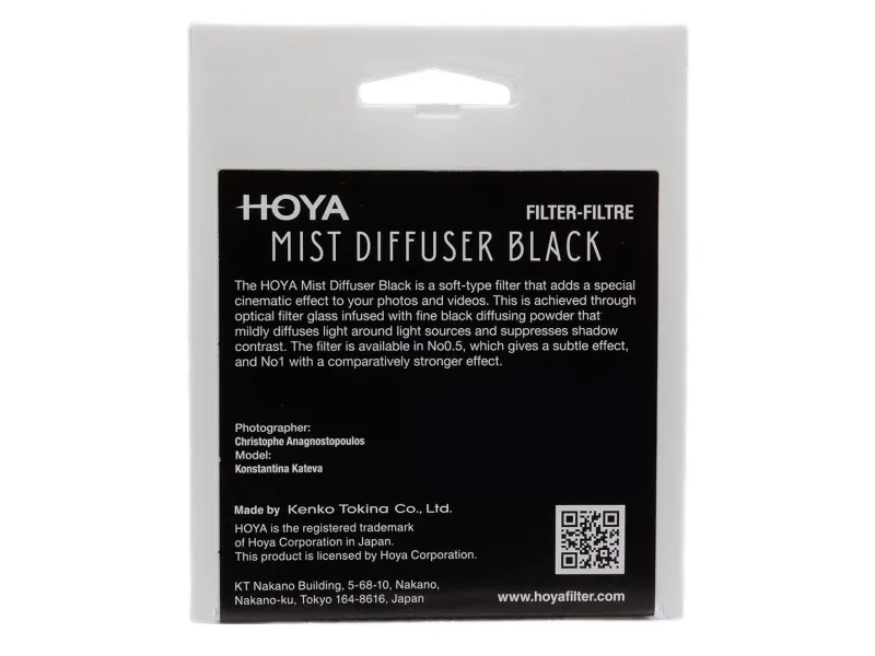 OVERVIEWThe HOYA MIST DIFFUSER BLACK series is an effect filter that creates a black mist effect through diffusing objects in an image, giving it a stylish cinematic look. This special kind of mist effect is achieved by equally distributing a fine black nano powder between two layers of optical glass. Built with a non-coated glass surface for a better-looking effect and enhanced flares. With two versions available, MIST DIFFUSER BLACK No0.5 and No1, it is possible to select the desired intensity for your photo.LIKE A SCENE FROM A MOVIEThe HOYA MIST DIFFUSER BLACK is a soft type filter that adds a special cinematic effect to your photos and videos through diffusing light around light sources and slightly suppressing shadow contrasts, creating exquisite nuances reminiscent of a scene in a movie. The appeal of the MIST DIFFUSER BLACK is that it allows you to obtain a cinematic quality on the spot, without retouching.Thanks to its soft effect, the HOYA MIST DIFFUSER BLACK is also great for portrait shots. It smoothens skin texture and reduces overall contrast, giving models a stylish look. Compared to other soft filters, the MIST DIFFUSER BLACK does not whiten the image.The MIST DIFFUSER BLACK can also create a special atmosphere in landscape photography. For example, it makes for a fantastic atmosphere by blurring the light through the trees. If the exposure compensation is set to a brighter setting, the blurring of light becomes even stronger.MIST DIFFUSER BLACK IN VIDEOGRAPHYThe HOYA MIST DIFFUSER BLACK gives videos a classic vintage look that is reliably repeatable across various cameras and lenses. It takes away the time-consuming work to add a diffusion effect in post-production and gives camera operators and directors instant feedback on the set.CHOOSE BETWEEN NO0.5 AND NO1 FOR YOUR PREFERRED STRENGTHThe HOYA MIST DIFFUSER BLACK series is available as No0.5, for a rather mild softening effect, and No1 with a comparatively stronger effect. Compared to the No0.5, the MIST DIFFUSER BLACK No1 has a greater light diffusing effect especially in strong backlit or night scenes. The No0.5 keeps a more subtle effect, making the filter perfect in any situation, even with strong backlighting.TIPS FOR SHOOTING- MIST DIFFUSER BLACK No0.5 and No1 are recommended for different scenes. No0.5 is suitable for night scenes and backlit scenes when the sun starts to set, while No1 is more suitable for forward lit or low light situations.- The soft effect is stronger when the focal length of the lens is on the telephoto side and weaker at the wide-angle side.- The effect may vary depending on the type of light source and other shooting conditions like for example shutter speed.- The effect seen in the viewfinder and the result of shooting (depending on print, monitor size, etc.) may differ.- The final result will also change depending on the exposure compensation, so it is recommended to use exposure compensation if necessary.FEATURES- Aluminum frame for best durability while being lightweight.- Low profile frame to minimize risk of vignetting. Hoya Mist Diffuser Black No0.5. Filter size: 6.2 cm, Filter type: Diffusion camera filter, Coating: No coating. Quantity per pack: 1 pc(s). Product colour: Black