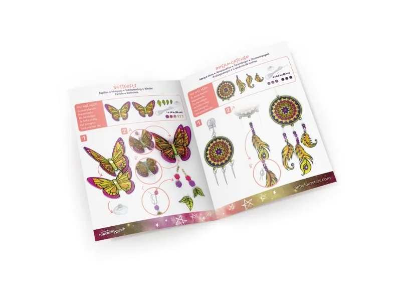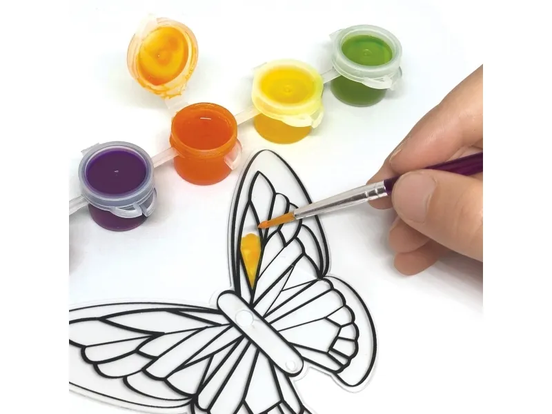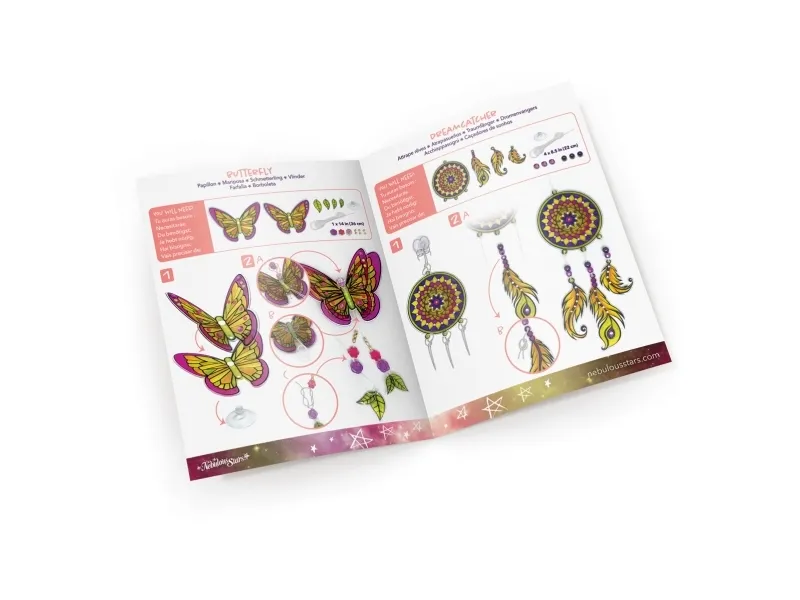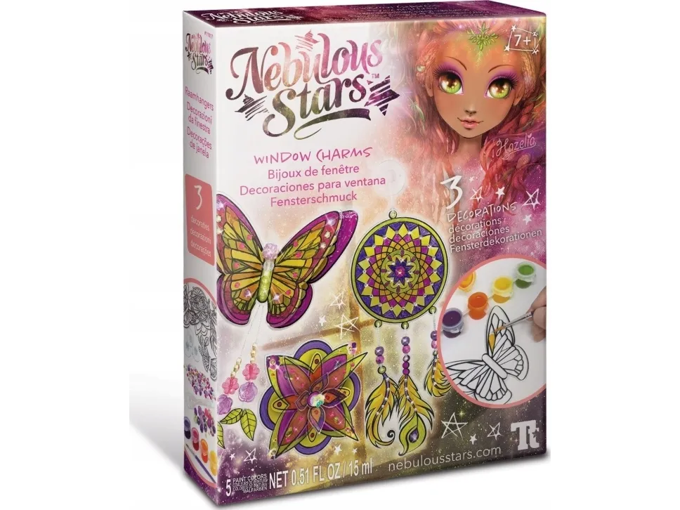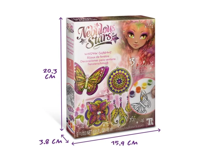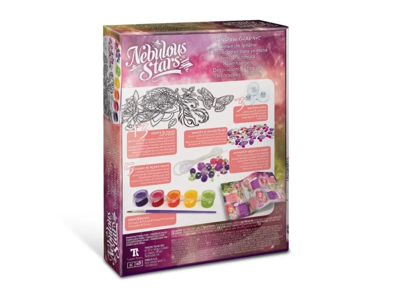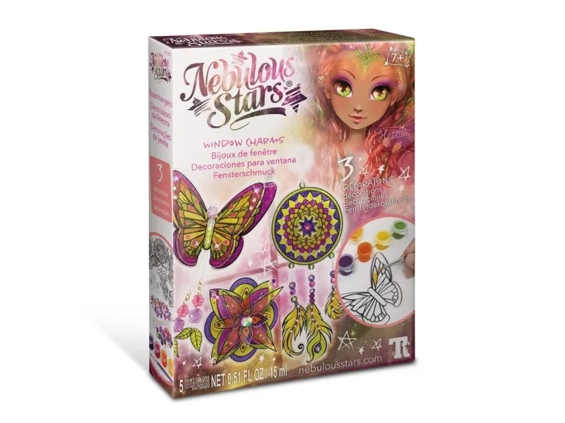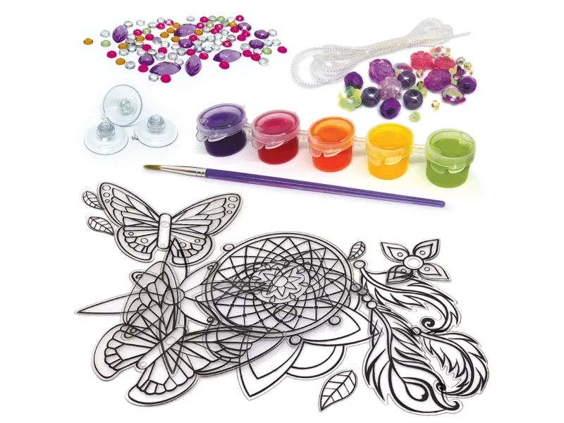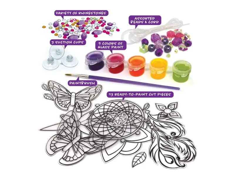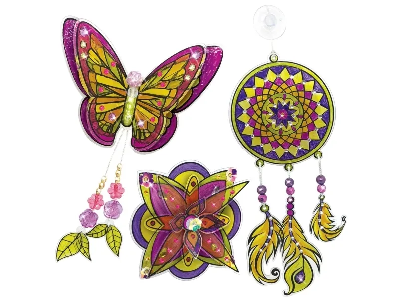 Lag 3 magiske vindussmykker. Mal de kuttede stykkene, legg til rhinestones for å dekorere og fest deretter til en sugekopp med snor og perler.